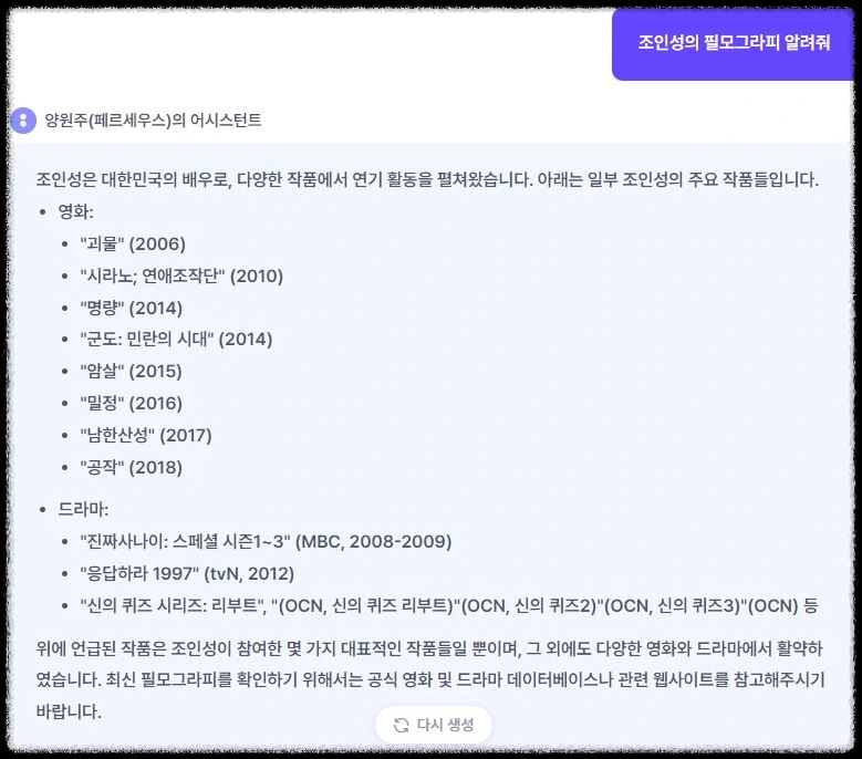 제가 좋아하는 배우 중 하나인 조인성 씨에 대한 질문을 던져봤습니다. 2021년까지의 정보 밖에 없다고 답한 인공지능이 이번에 개봉한 <밀수>라는 작품을 답변 내용에 포함해서 답을 할지 궁금해서였죠.