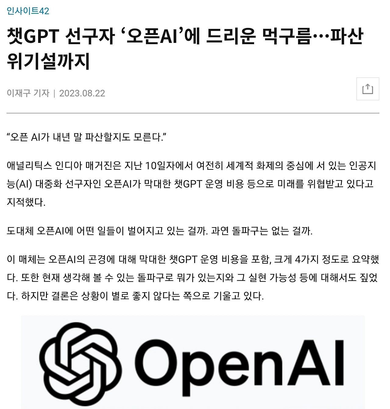 그런 와중에 놀라운 소식을 하나 더 접했습니다. 멀기만 느껴졌던 인공지능 시대라는 개념을 활짝 열어젖히며 듯했던 챗 GPT를 개발한 오픈 AI가 심각한 재정위기에 처했다는 뉴스였죠. 제대로 된 수익모델을 만들지 못하고 투자를 받지 못해서라는 내용이었습니다.
