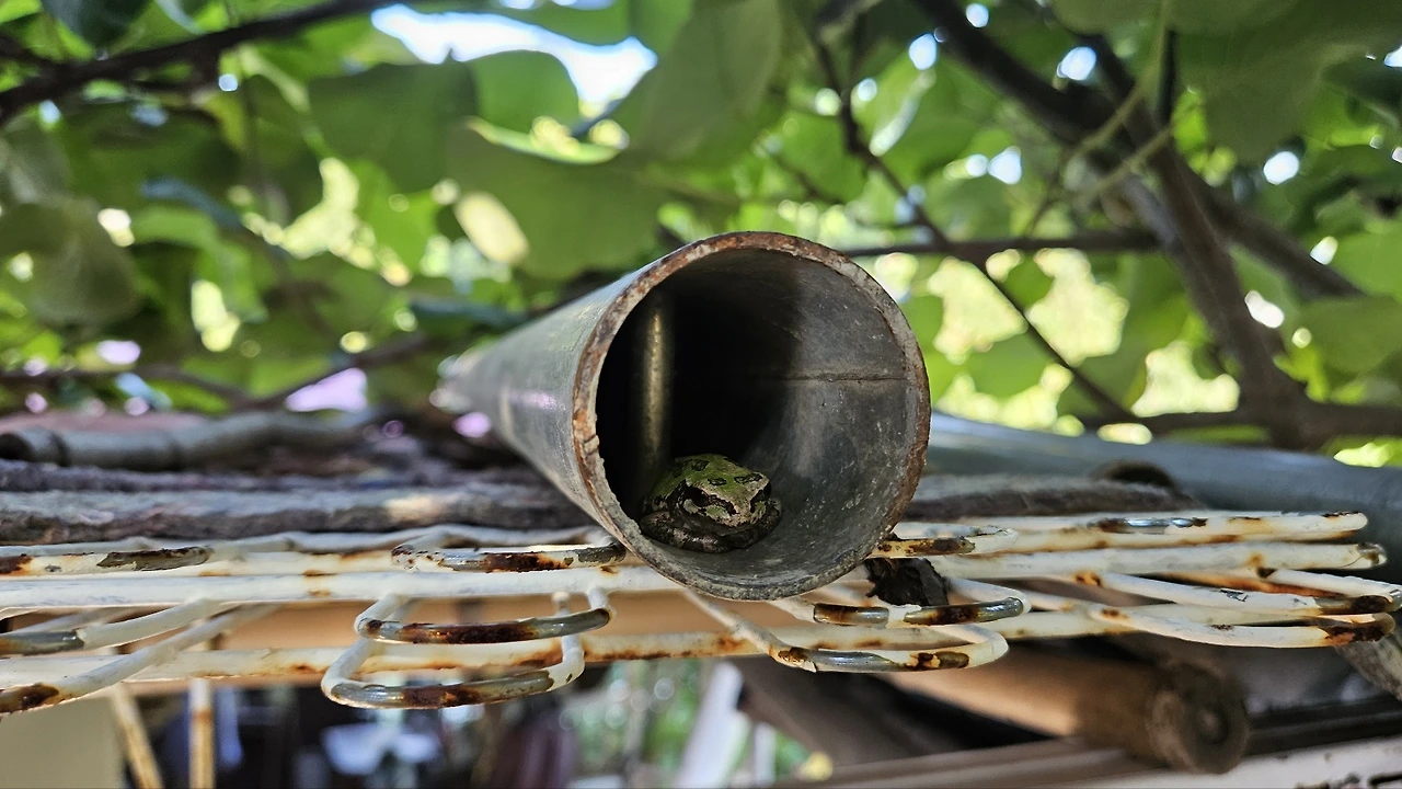 개구리가 지붕의 용도로 쓰고 있던 폴대 안에 슬쩍 숨어 있습니다.
