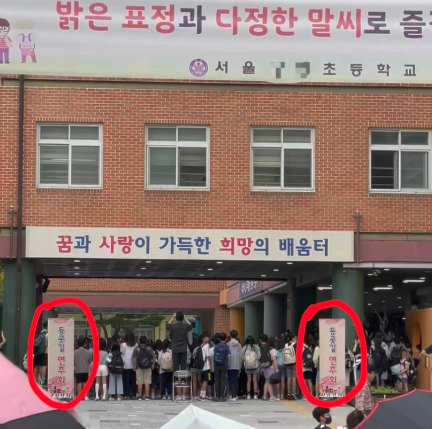 학교 출입문 앞에 간이무대를 설치하고
