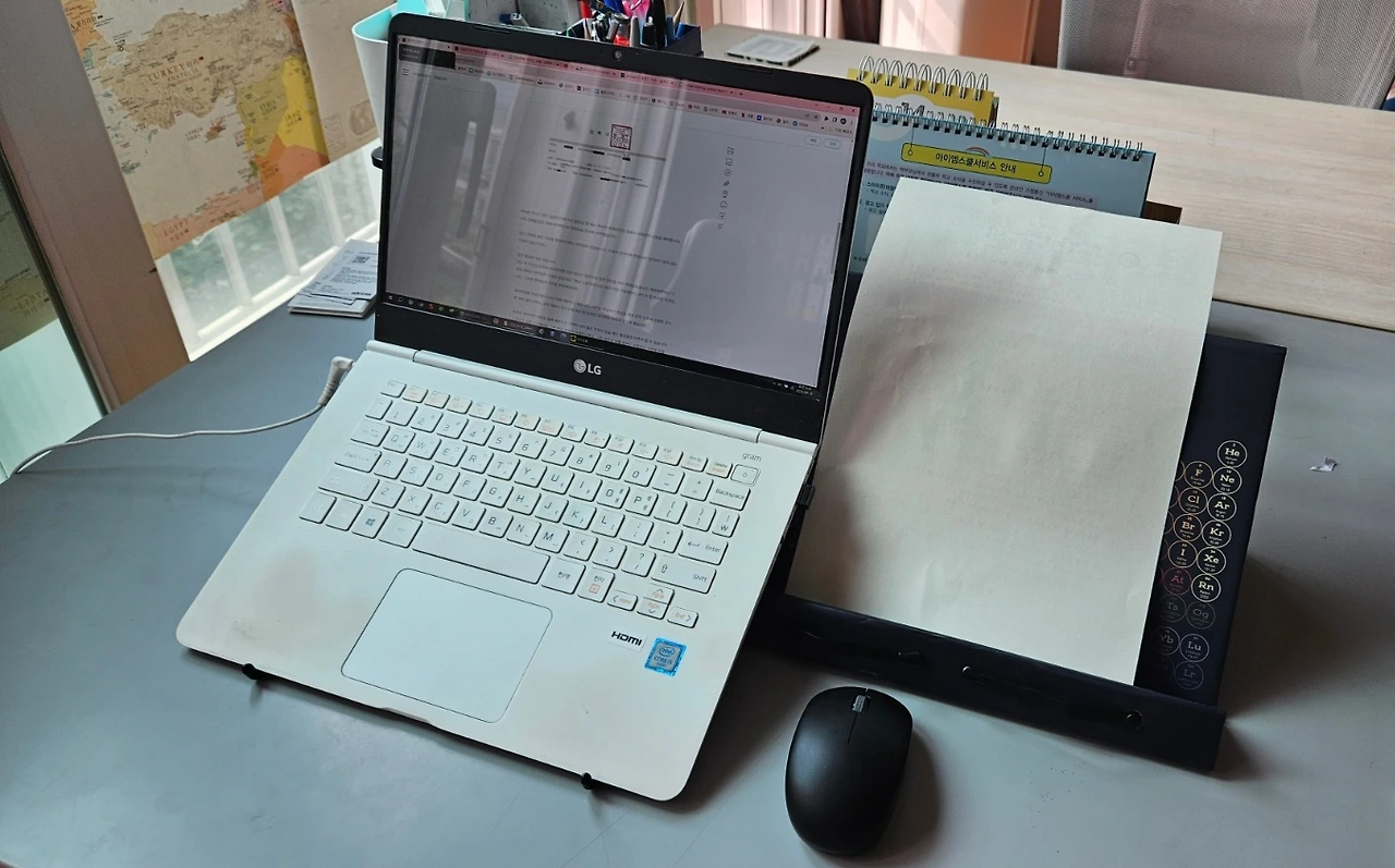 강의 대본도 지난번 온라인 강의와는 다른 방식으로 준비했습니다. 만약 온라인 강의라면 아래 그림처럼 대본을 노트북 옆에 세워두고 기억이 나지 않는 부분이 있을 때는 흘끔흘끔 보면서 할 수 있습니다.