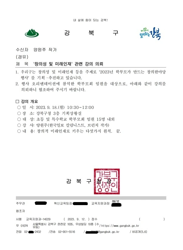 알고 보니 제가 하게 된 강의는 구청에서 진행하는 창의력 관련 사업의 일환이었는데요. 각급 학교에 예산을 배분해서 행사를 기획해 진행하는데 강북구 내의 초등학교 학부모회장단이 강의대상이었습니다.
