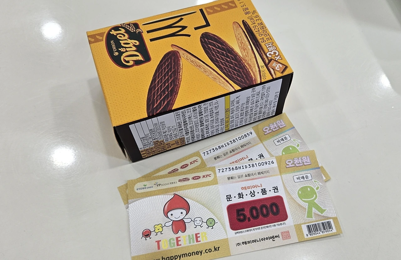 가는 곳마다 주는 음료와 간식이 천차만별입니다. 수유센터에서는 다이제를 줍니다. 거기에 문화상품권을 주니 책 권을 더 살 수 있겠다는 생각이 들어서 기분이 절로 좋아집니다.