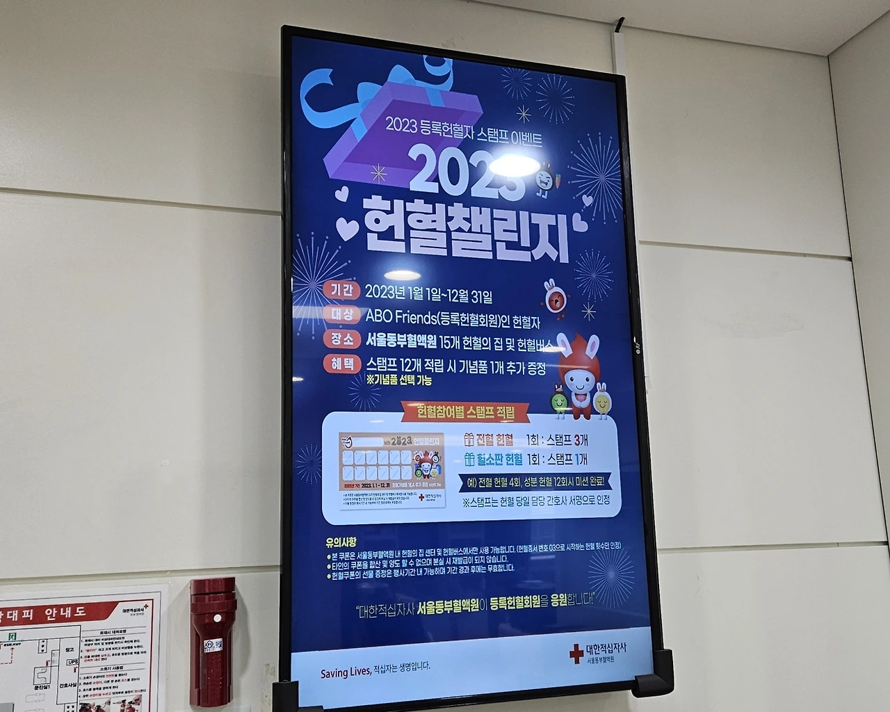 광고판에 올해 활동을 장려하는 챌린지에 대한 내용이 나옵니다. 스탬프를 열두 개 적립하면 사은품을 더 준다고 하는데 스탬프 그렇게 받으려면 전혈만으로만 네 번을 해야 합니다. 혈소판으로는 열두 번이고요. 혈장은 받지도 못해요.