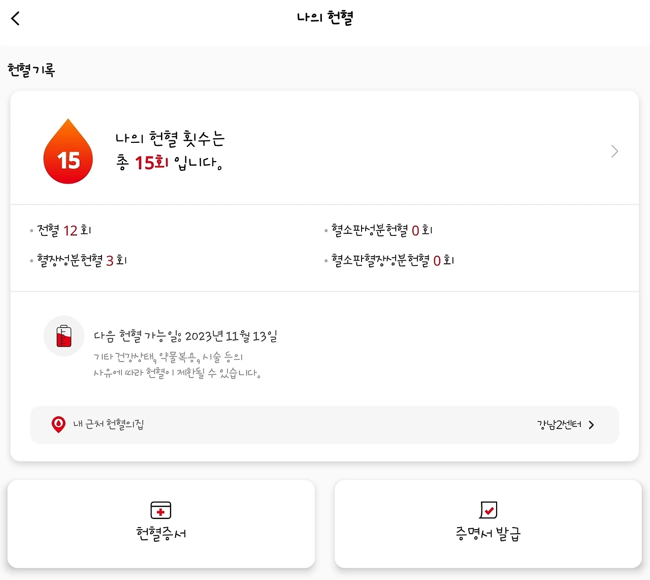 요즘에는 적십자에서 어플을 놓은 덕분에 제 헌혈에 대한 정보를 수시로 확인할 수 있습니다.