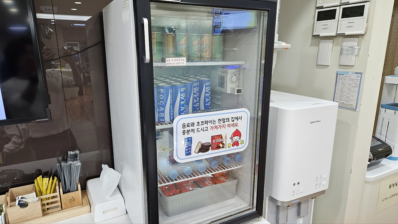 헌혈을 마치고 기다리는 동안 잠시 둘러보는데 냉장고 문에 붙여놓은 '가져가지 마세요'라는 문구가 눈길을 끕니다.
