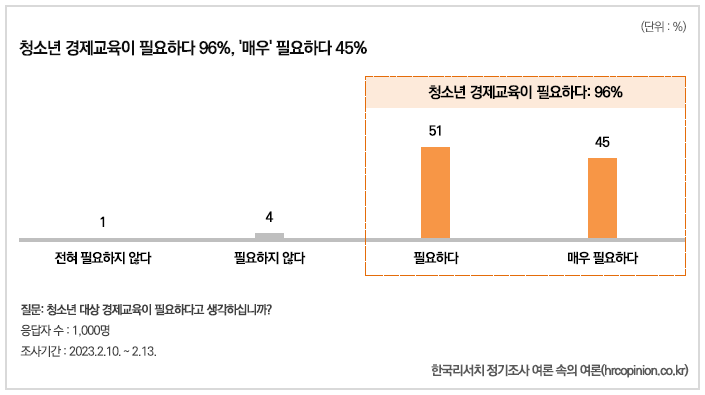 기획재정부에서는 지난해 10월 초‧중‧고교생 각 5,000명을 대상으로 ‘2022년 초·중·고 학생 경제이해력 조사’를 시행했습니다. 그 결과를 보면 중학생(45.4%)과 고등학생(51.4%) 모두 “경제교육 시간이 부족하다”라고 답했습니다.