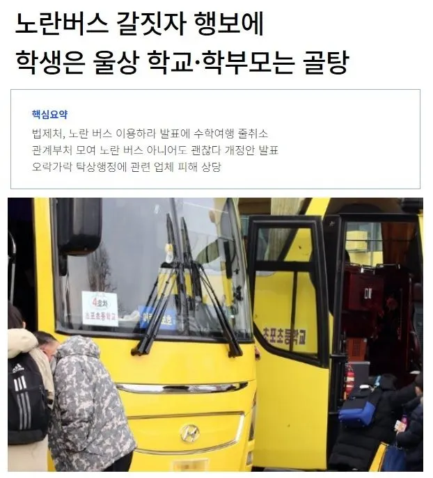 결국 학교 측에서는 9월 초에 안전 문제를 우려해 수학여행을 비롯한 현장체험학습을 대부분 취소해 버렸습니다. 9월 말에 정치권에서 학부모, 학생, 버스 업계의 반발을 우려해 부랴부랴 개정안을 발표했지만 그야말로 쏟아진 물은 주워 담을 수 없는 상황이었죠.