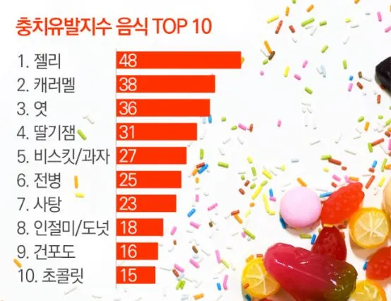 아이들의 치아건강에 가장 치명적인 음식은 그동안 젤리나 캐러멜 정도였습니다. 50점이 만점인 충치지수에서 젤리가 48점, 캐러멜이 38점, 엿이 36점이었습니다. 그런데 탕후루가 선풍적인 인기를 끌면서 그들을 꺾어버렸죠.
