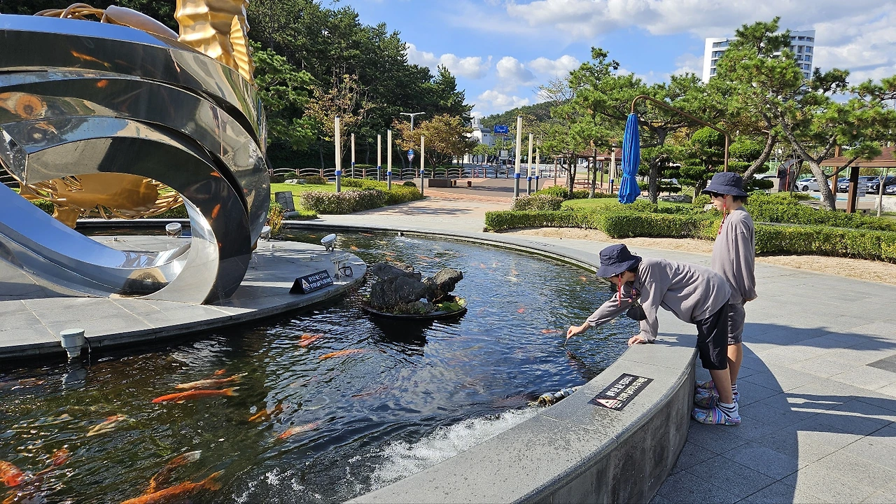 터벅터벅 걸어오는 동안 두 마리 해마동상이 가운데 자리 잡고 있는 분수를 발견합니다. 분수에는 잉어들이 생각보다 많습니다. 신이 나서 열심히 헤엄치는 모습이 저희에게 힘을 북돋워주는 듯해 보입니다.