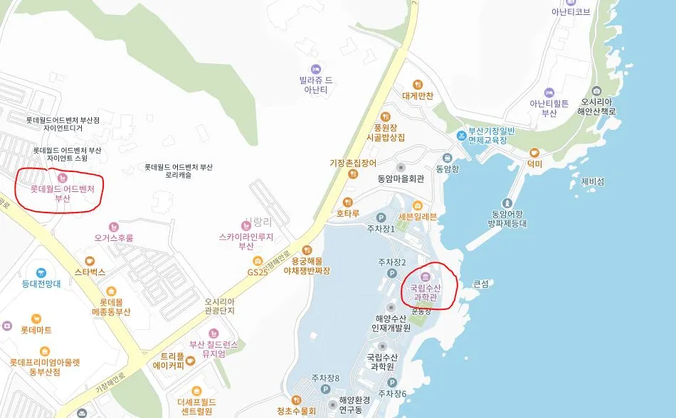 그래도 구경할 곳이 많은 부산이기에 어디라도 가면 좋겠다고 말이죠. 물론 미리 세워둔 계획은 없었습니다. 요즘 제 여행의 콘셉트가 무계획 여행이거든요. 공교롭게 숙소인 아난티힐튼 리조트 근처에는 두 가지 선택지가 있었습니다. 바로 국립수산과학관과 롯데월드 부산입니다.