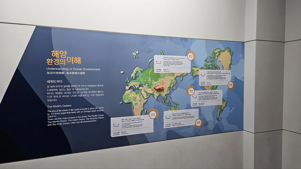 로비를 통해서 안으로 들어갔는데 생각보다 다양한 콘텐츠들이 있습니다. 아이들은 물론 어른들의 호기심도 자극합니다. 총 세 개 층으로 이루어져 있는데 대부분 해양생태계, 해양환경, 어업의 역사 등 바다와 관련된 많은 내용들이 총망라되어 있습니다.