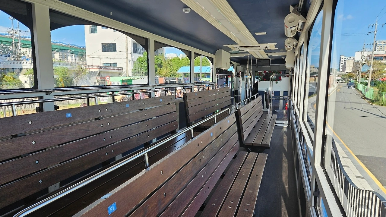 기차의 내부는 남달랐습니다. 한쪽 방향으로만 앉을 수 있게 되어있었습니다. 바다가 보이는 방향으로 말이죠. 지금은 비어있는 상태를 찍었지만 승객이 탑승하면 두 줄의 벤치는 옹기종기 사람들로 가득 차고 그 뒤에도 사람들이 서서 갑니다.