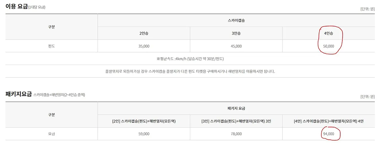 그런데 검색을 해보니 스카이캡슐을 왕복으로 타기 아무리 못해도 9만 원 이상의 요금이 필요했기에 저의 무지함은 지갑을 든든하게 해 줬습니다. 해변열차는 어린이할인을 받아서 41,000 원이었거든요.