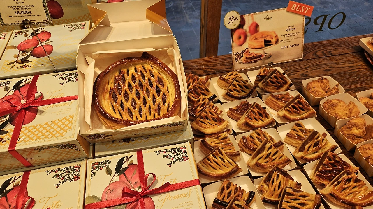 모든 빵들이 다 좋아 보였지만 특히 이 애플파이가 어마어마했습니다. 값은 하나짜리가 1.9만 원, 반 개가 9천 원으로 비싼 편입니다. 사실 이 빵집의 모든 빵이 파리바게트나 뚜레쥬르 같은 공장형 빵집에 비해서 옵스에 있는 빵들은 값이 저렴하지는 않았죠.