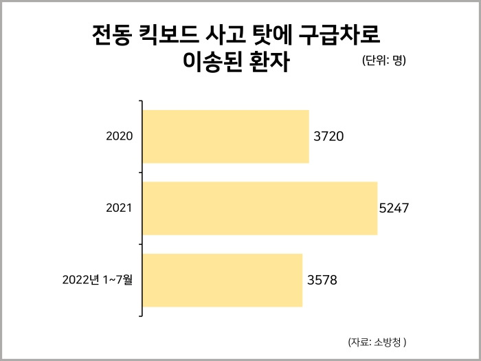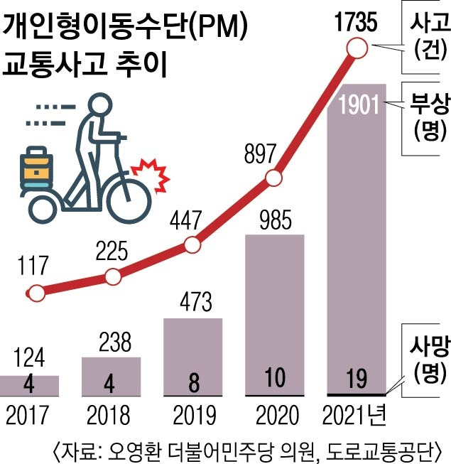그런데 이런 개인형 이동수단(Personal Mobility)으로 인한 문제가 점점 더 늘어나고 있습니다. 일단 사고의 비율도 높아졌습니다. 사고 1건에 평균적으로 최소 1명 이상이 다치고 있는 실정입니다.