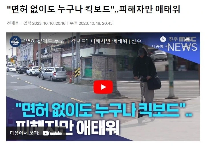 심지어 최근 뉴스에 나왔던 10대 청소년들의 전동킥보드 사고는 이 허술한 제도를 여실히 보여줍니다. 면허증 등록 없이도 청소년이 손쉽게 전동킥보드를 빌려 탈 수 있다는 사실