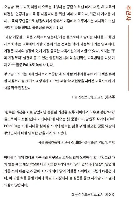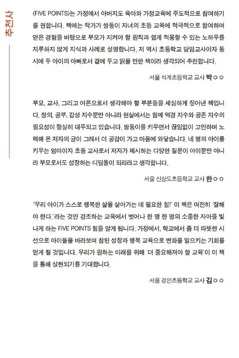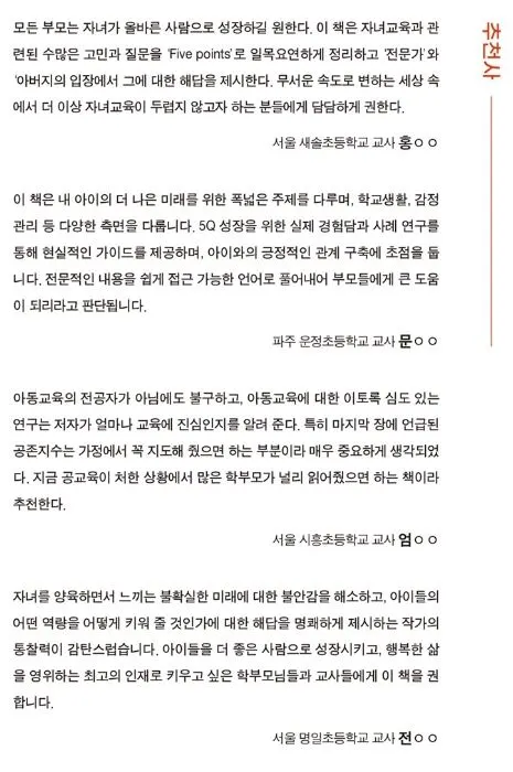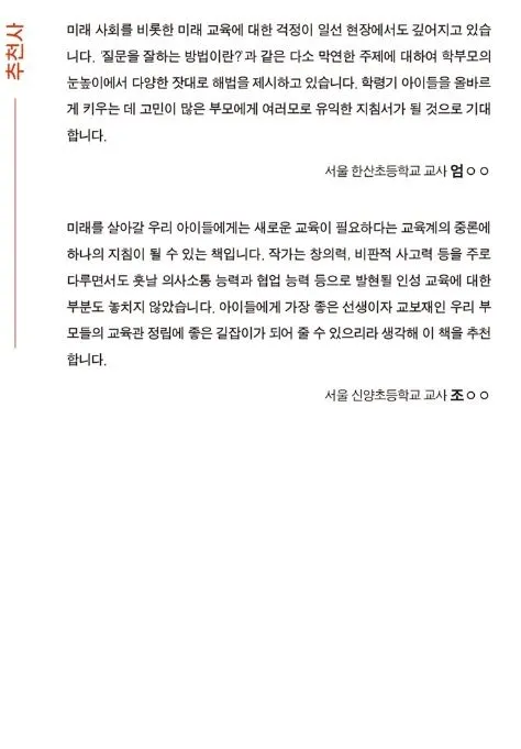 이 책은 다섯 개의 챕터로 구성되어 있다. 새로운 시대에서 살아남기 위해 올바르고 좋은 질문을 스스로 찾을 수 있는 아이로 키우기 위해 필요한 요소들을 200명이 넘는 학부모님들의 대면 설문