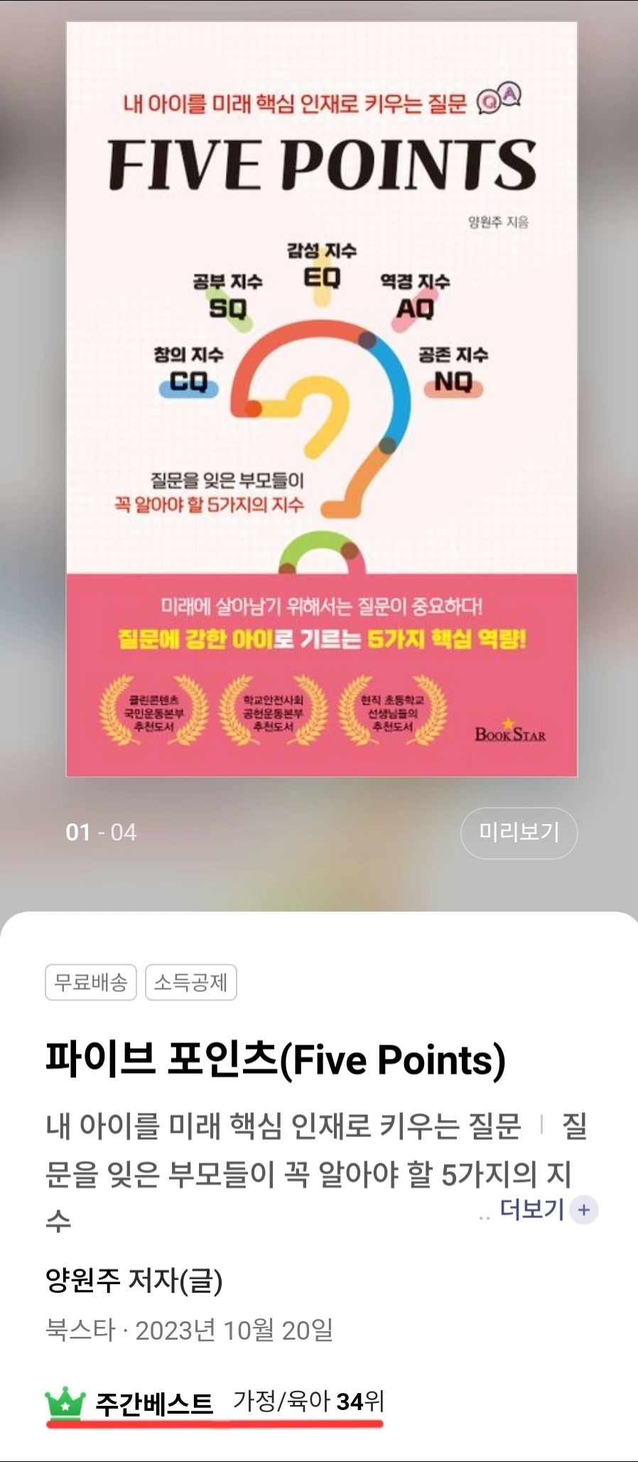 이런 와중이지만 4년 동안 준비한 자녀교육책인 <파이브 포인츠>는 정말 감사하게도 과분한 사랑을 받고 있습니다. 브런치 글벗들을 비롯한 많은 분들이 관심을 가져주셔서 이름이 높으신 분들의 책들과 함께 자리를 나란히 하고 있습니다.