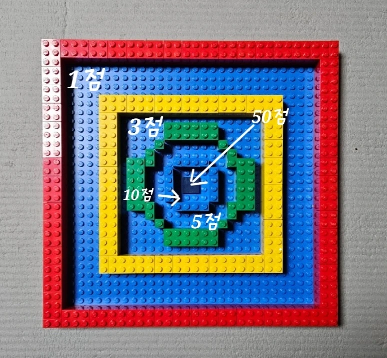 이번 주말에 1호가 새로운 방식의 레고를 만들었기에 소개합니다. 바로 레고로 만든 투호(投壺)입니다. 테두리로 둘러싸여진 공간마다가 각각의 점수가 배정되어 있으며 정해진 개수의 레고 1X1 크기의 조각을 던져서 점수가 높은 사람이 승리하는 방식입니다.
