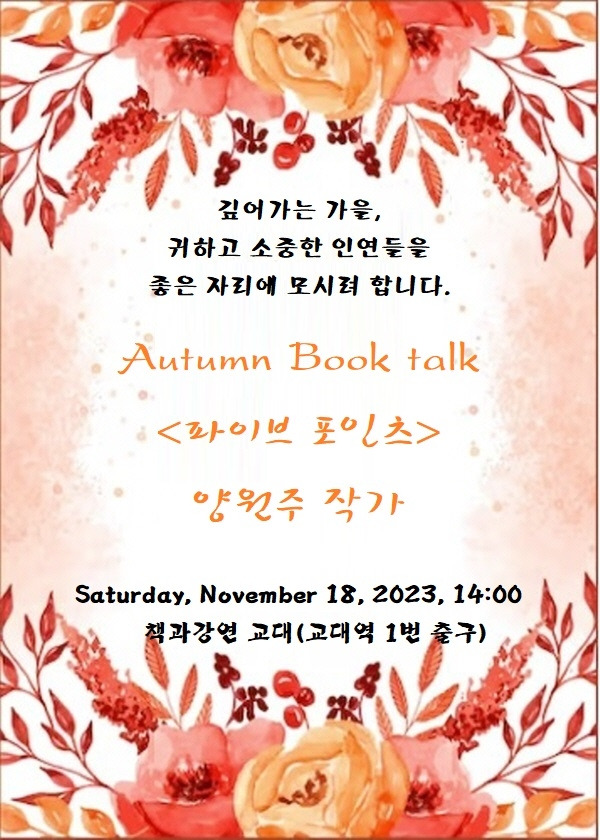 이런 자리를 만들 수 있도록 오랜 시간 동안 애정과 관심을 나눠주신 글벗들께도 머리 숙여 감사인사를 드립니다. 남은 기간 동안 준비를 열심히 해서 북토크 행사를 최대한 재미있게 해 보도록 하겠습니다. 제 인생의 모토가 "행복하고 건강하고 재미있게"니까요.