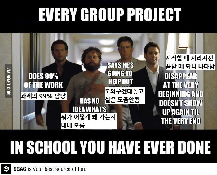 특히 인터넷에 떠도는 조별과제를 할 때 괴롭게 하는 다섯 가지 유형은 경험해 본 사람이라면 격하게 공감을 합니다.