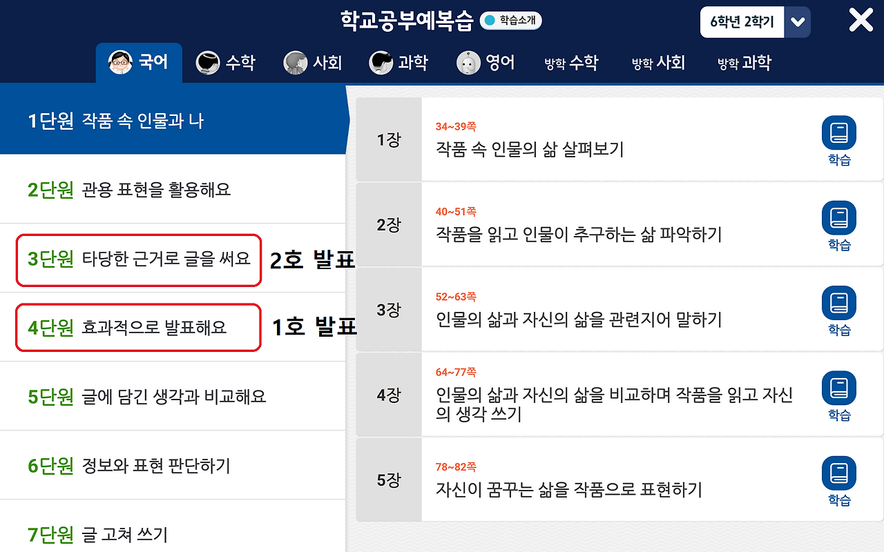 1호의 과제는 4단원 '효과적으로 발표해요'를 기반으로 자신이 정한 주제를 동영상으로 만들어서 발표하는 그룹과제였고 2호의 과제는 3단원 '타당한 근거로 글을 써요'를 기반으로 기사를 작성해 뉴스 동영상을 만드는 팀과제였습니다.