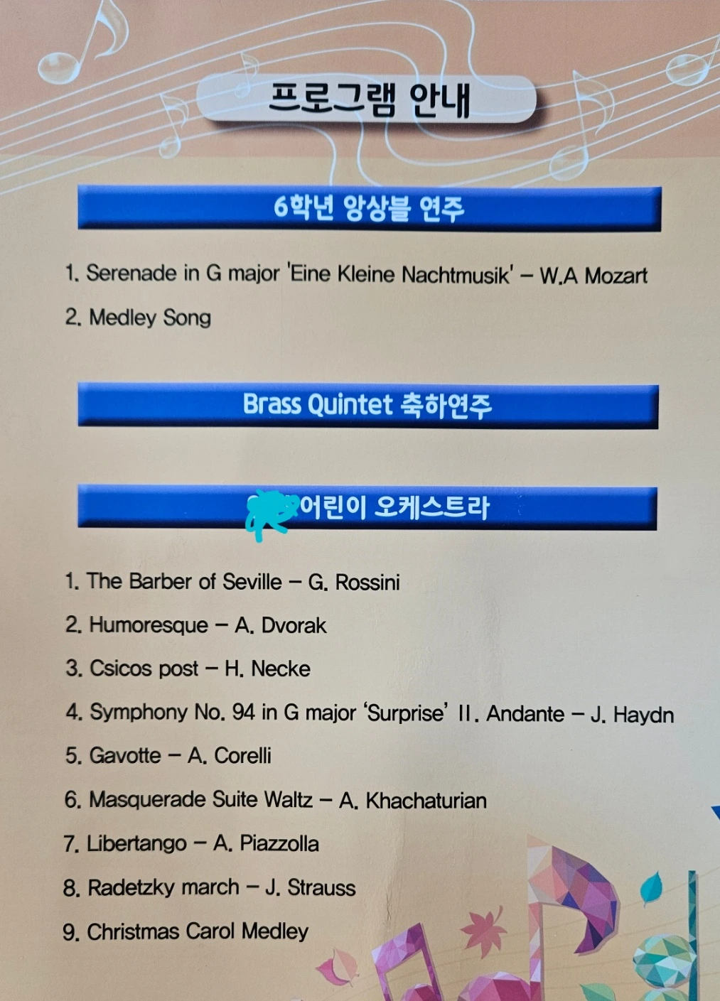 재개된 오케스트라 활동은 그리 순탄하지 못했습니다. 관악기를 다루는 단원이 일단 많이 부족했죠. 관악기 파트는 클라리넷 없이 플루트 밖에 없는 데다 6학년도 제 아이 한 명 밖에 없을 정도였으니까요.