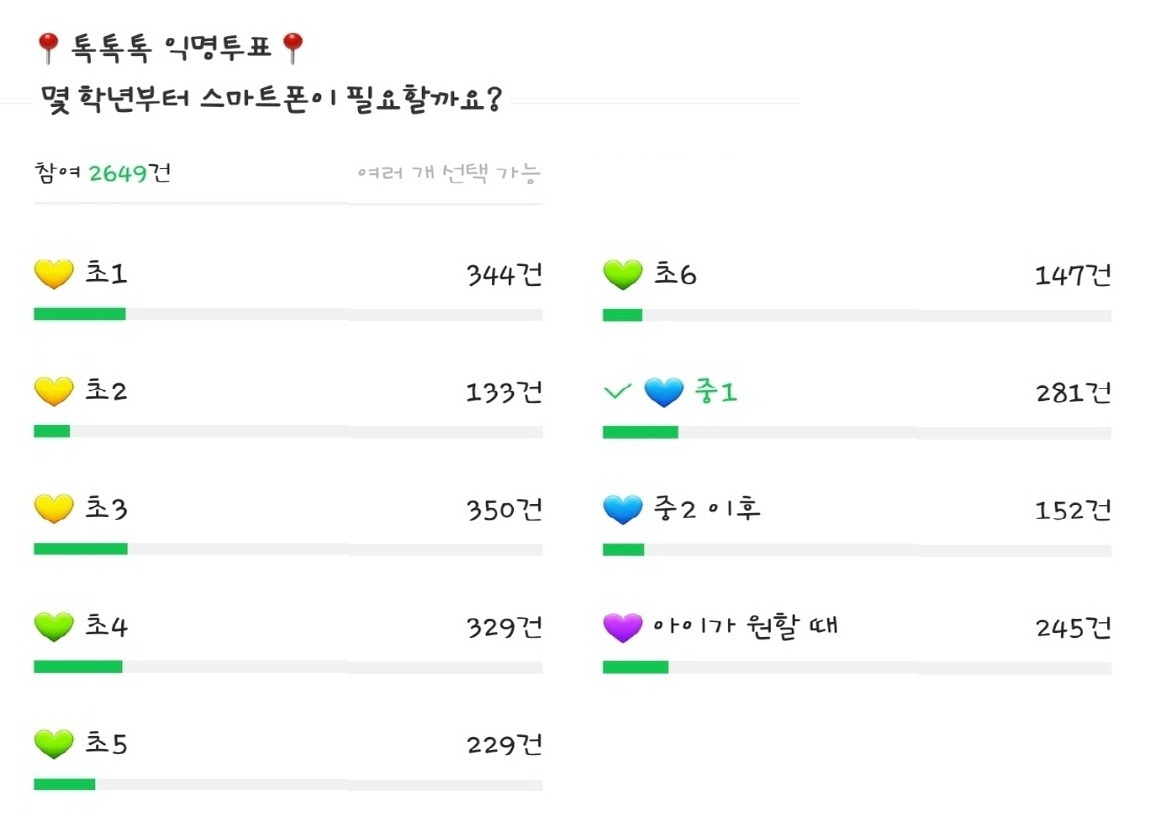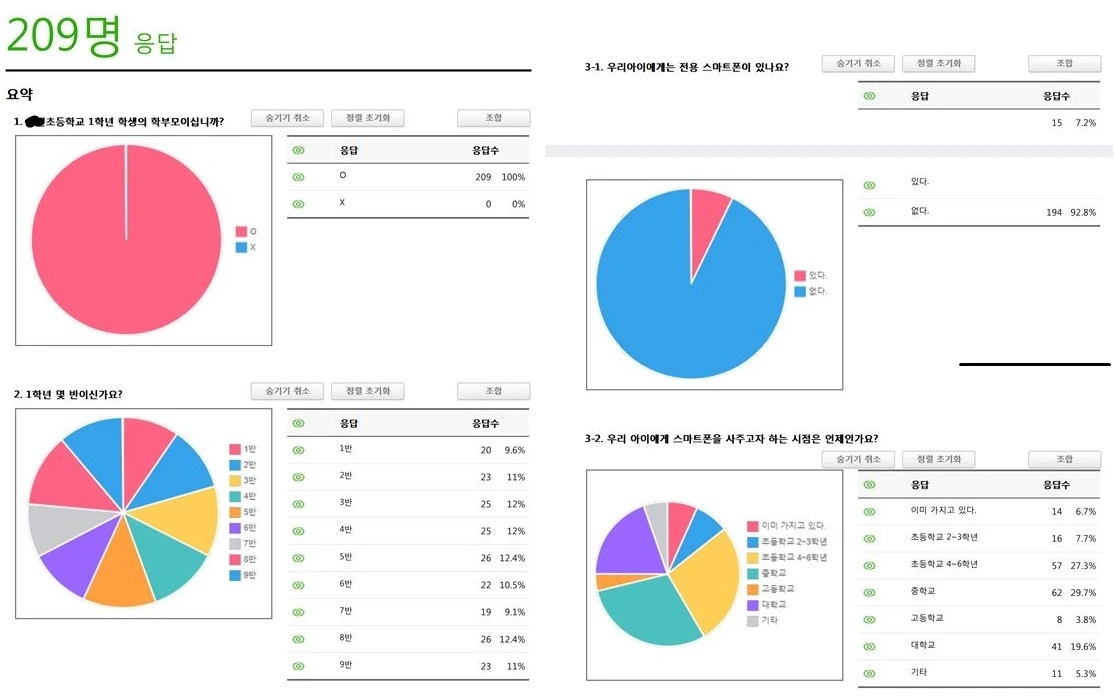 이 설문은 253명의 전체 1학년 학부모님들 중에서 210명의 응답을 받았으며 엄마들 대부분이 아이의 스마트폰 사용을 부정적으로 보고 있었습니다. 쓸데없어 보이기까지 하는 이런 행동을 한 이유는 간단했습니다. 스마트폰이 아이들에게 얼마나 치명적인 독이 될 수 있는지에 대해서 함께 인식하고 헤쳐 나가야 한다고 생각했기 때문이었습니다.
