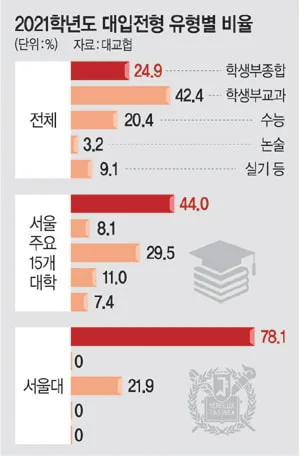 이 제도는 시작할 때부터 논란이 많았지만 점점 비중을 높여나가고 있었습니다. 극단적인 예라고 보일 수도 있지만 참고로 카이스트의 2021년 수시전형과 정시전형의 비율은 695명 대 15명 (97.8% : 2.2%)이었습니다.