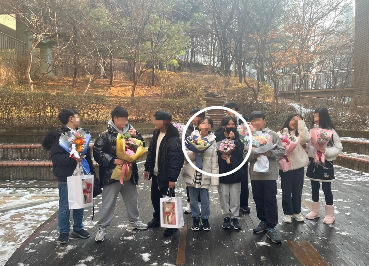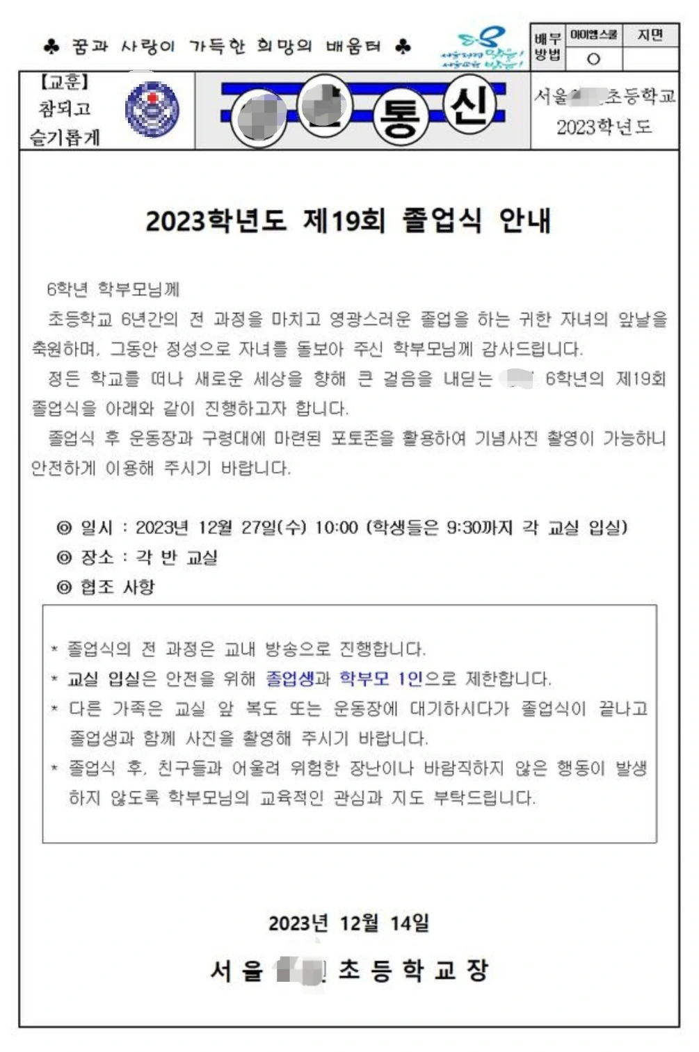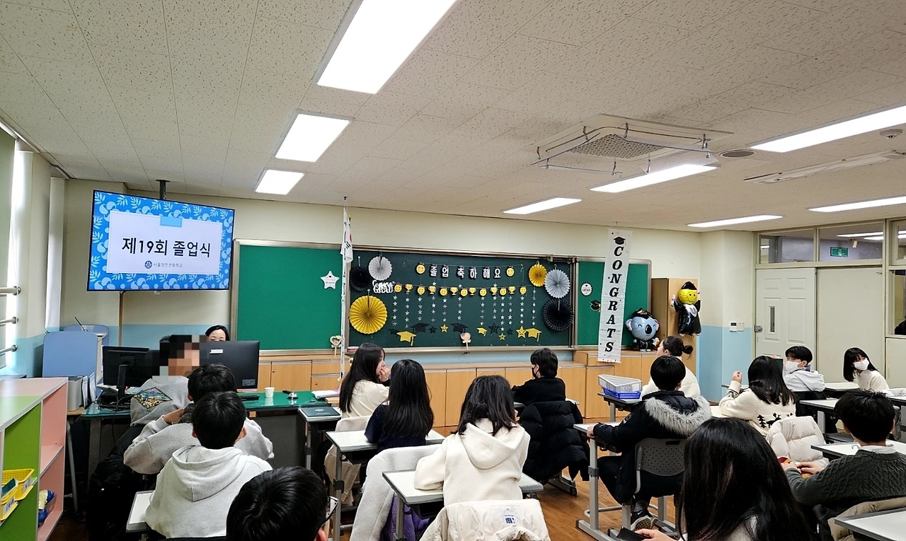 졸업식은 각각의 반에 모여서 방송으로 진행했습니다. 학교 측에서는 안전상의 우려로 한 학생당 한 명의 부모만 입실을 허용한다고 하니 그럴 수 있다는 싶으면서도 섭섭하다고 생각하시는 분들도 많으셨습니다. 교실 앞 복도에도 많이 와계시더라고요.