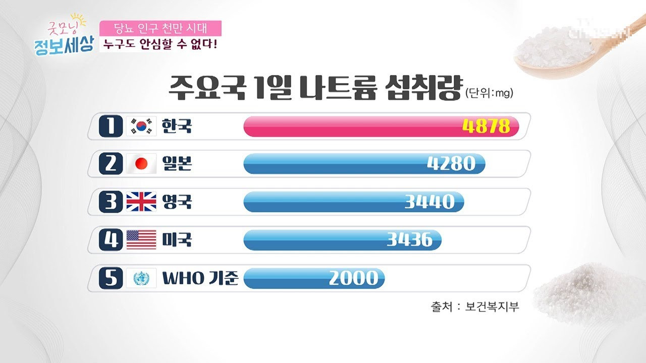 나트륨 과다섭취는 제가 어린 시절부터 뉴스에서 자주 언급되어 왔습니다. WHO가 절대적인 기준이 아닐지라도 평균보다 두 배가 넘는 섭취량은 단순하게 생각할 문제가 아니었죠.