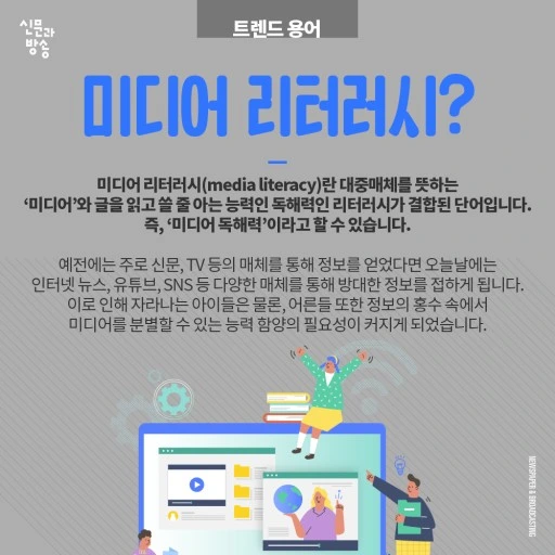 '미디어 리터러시'라는 용어는 미디어에서 나오는 정보를 단순하게 받아들이지 않으며 비판적으로 해석하고 검토할 수 있는 능력을 뜻합니다. 신조어죠.