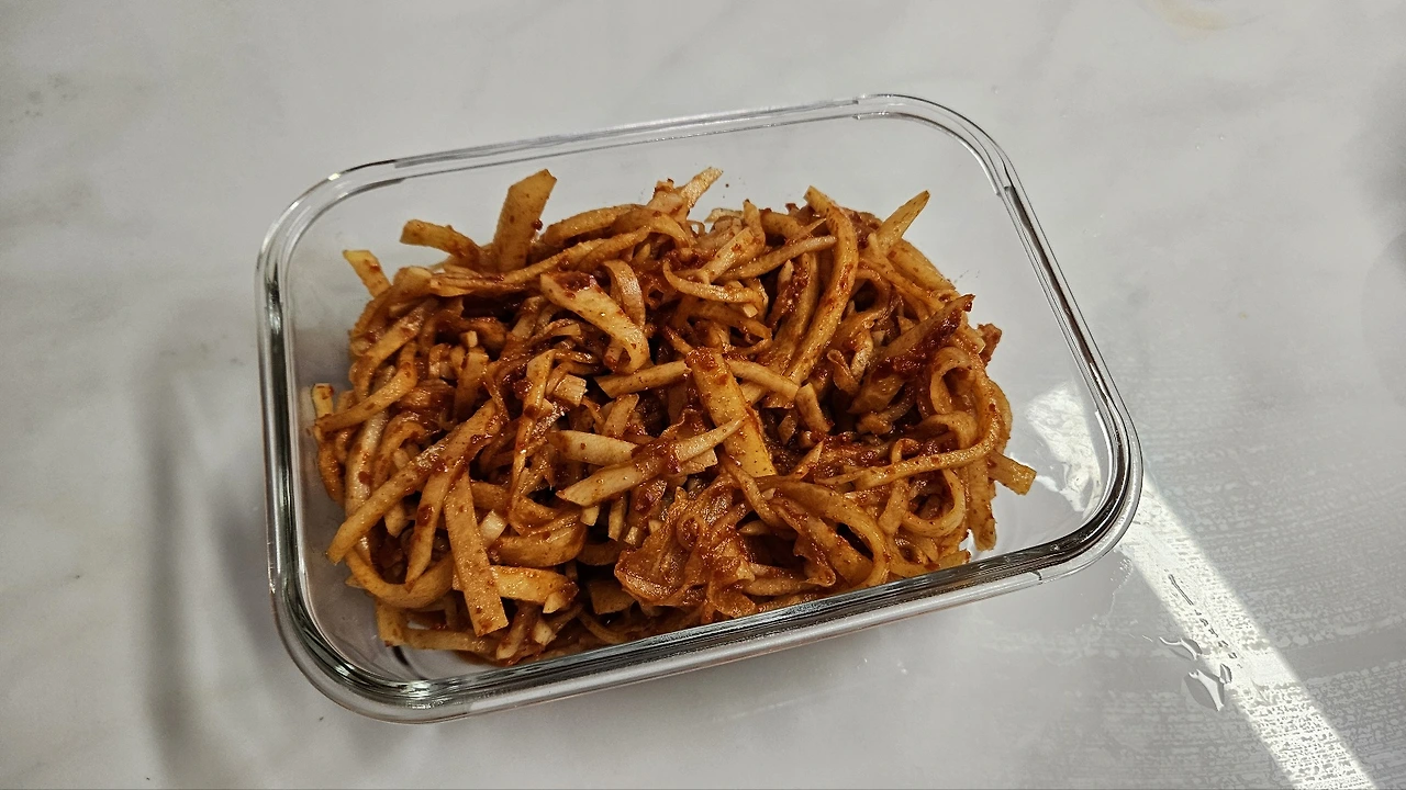 그래서 시간이 되면 행복이의 입맛에 맞게 한 번 집에서 만들어주면 좋겠다는 생각이 들었습니다. 뜻하지 않게 금세 기회가 찾아왔습니다. 아내가 무나물을 만들겠다며 무를 채 썰어서 담아놓는 모습을 발견했죠. 제가 대뜸 절반만 내놓으라고 말했습니다.