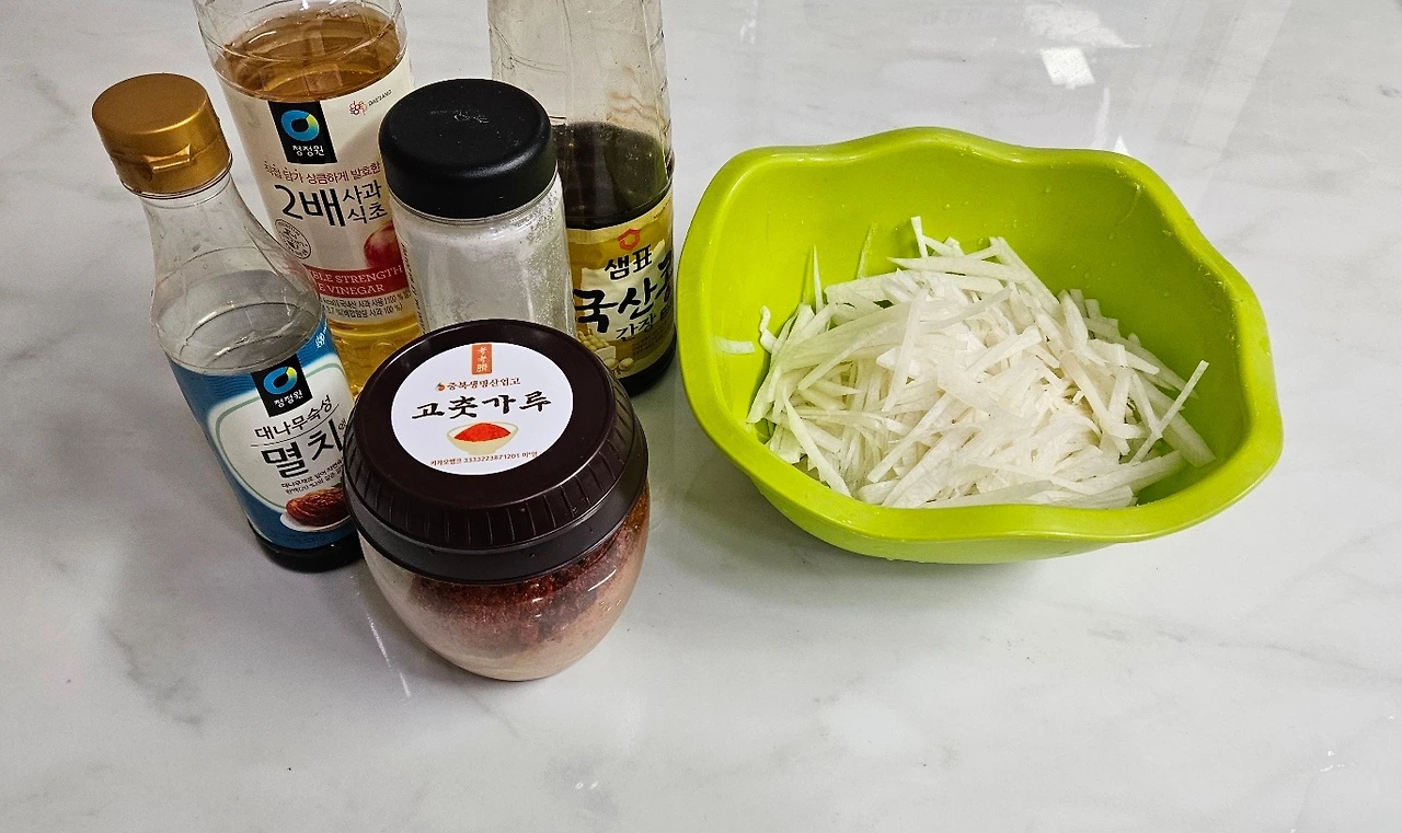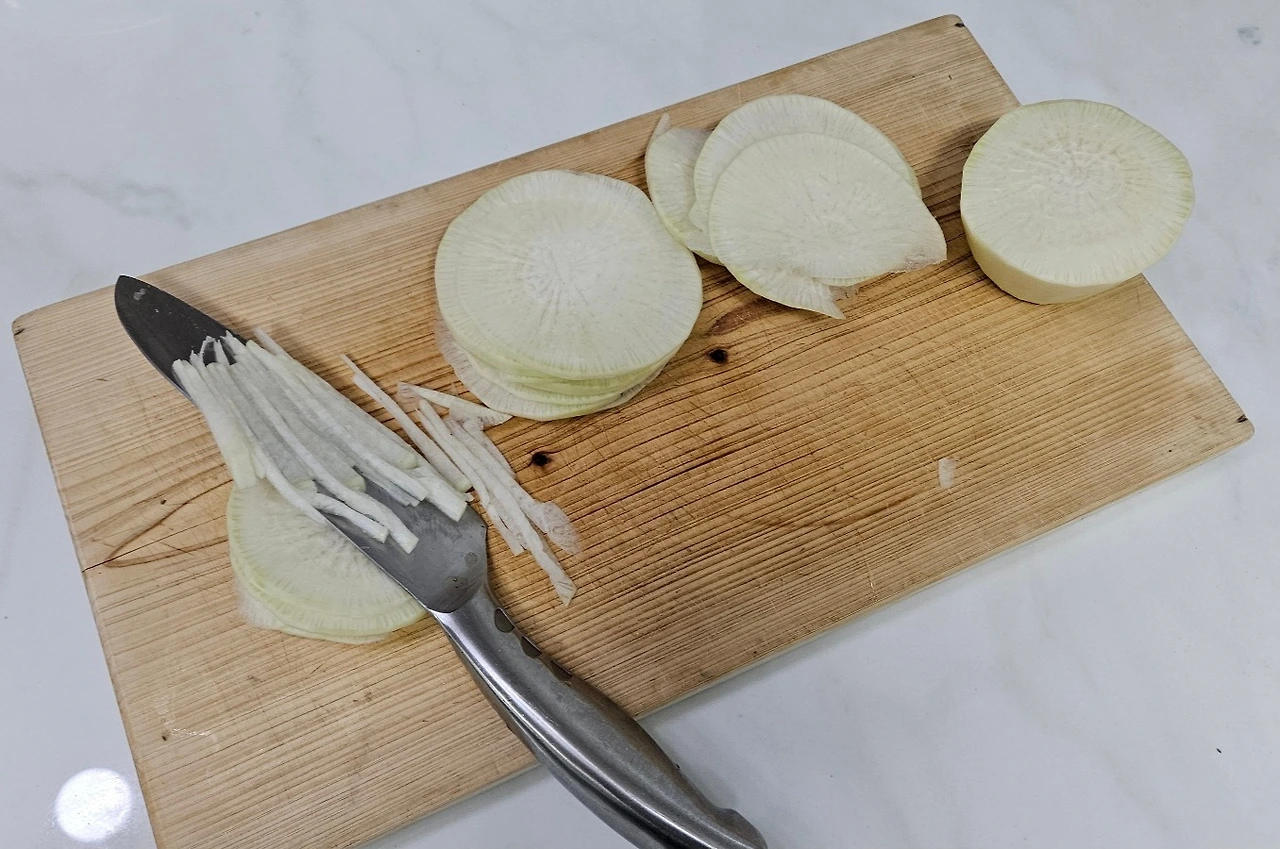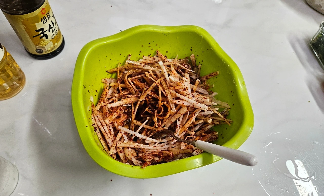 놀랍게도 저는 칼질을 하다가 한 번도 다친 적이 없는 무혈(無血)의 요리사입니다. 다행히 이번에도 순조롭게 잘 끝냅니다. 하지만 무 하나를 얇게 계속 썰고 나면 팔이 제법 아프기는 합니다. 채 썰기가 너무 두꺼우면 양념이 스며들지 않으니 맛도 덜할 테니까요.