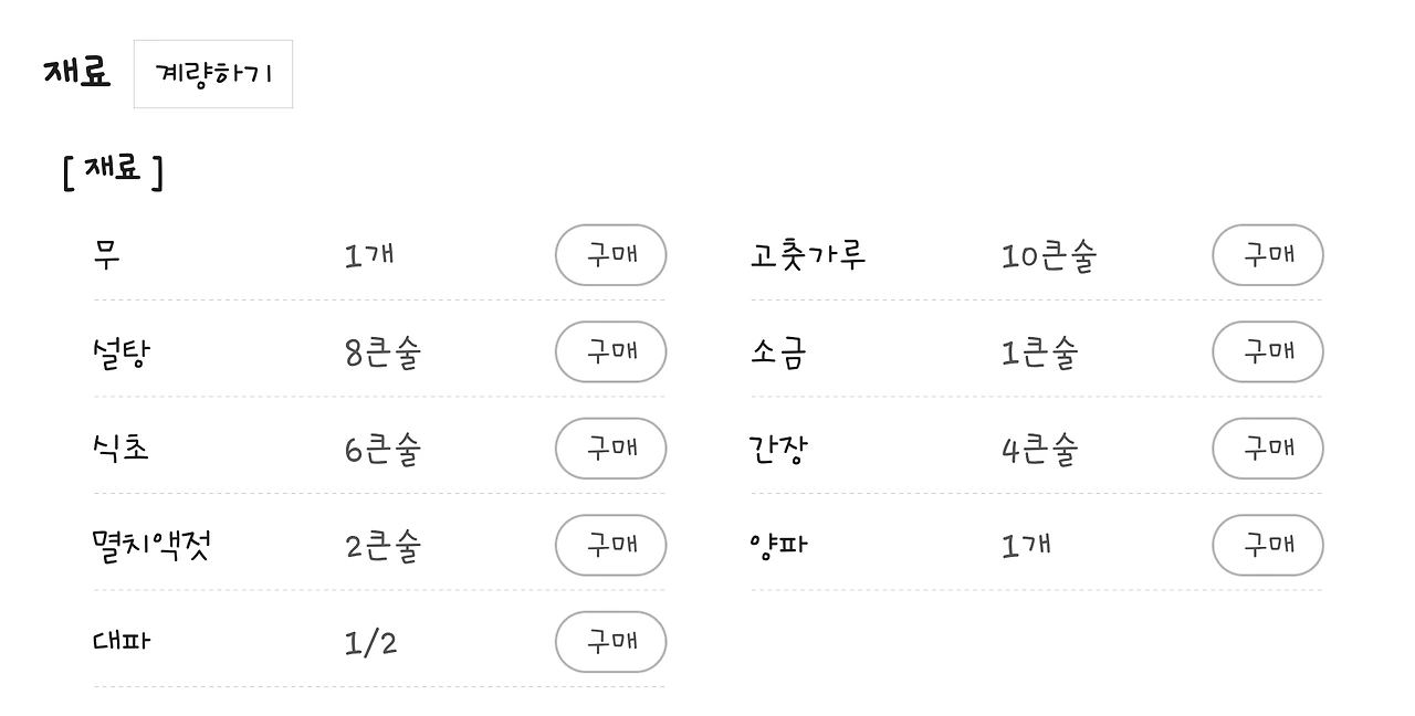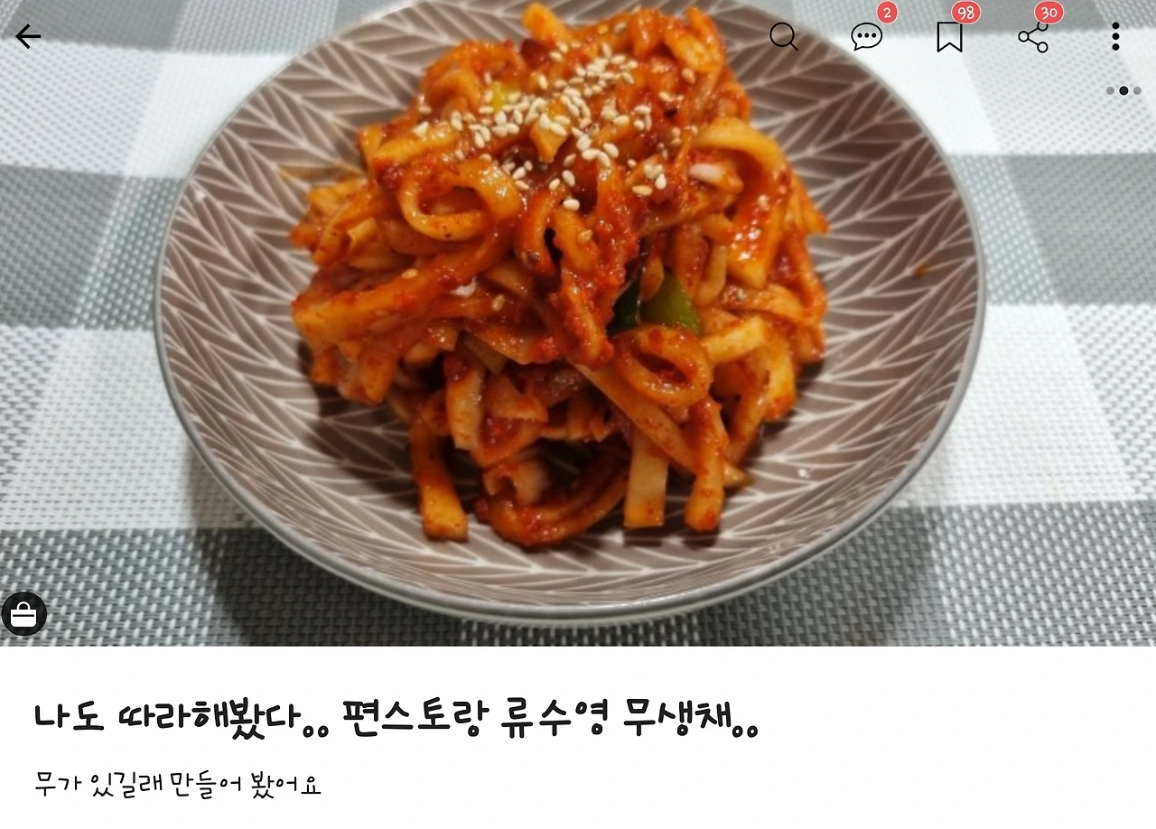 계획에 없던 도전이었기에 마음만 급합니다. 얼른 휴대폰을 집어 들어 조리법을 확인합니다. 레시피 어플에서 검색하니 수십 가지가 나옵니다. 그중에서 가장 눈길이 가는 메뉴는 바로 편스토랑의 히어로인 어남선 선생님이 만든 레시피였죠. 실제로 검색하면 어남선 무생채라고도 나옵니다.