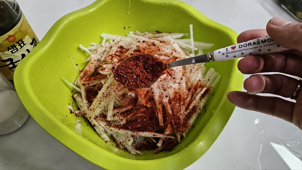 준비된 양념들을 레시피에 맞춰서 넣습니다. 썰어놓은 무가 반 개 조금 넘는 양이기에 적당히 절반의 비율로 양념을 넣습니다. 모자라면 더 넣으면 되지만 넘쳐버리면 수습하기가 배로 힘들어지니까요. 마지막으로 고춧가루까지 뿌려주면 양념은 끝납니다.
