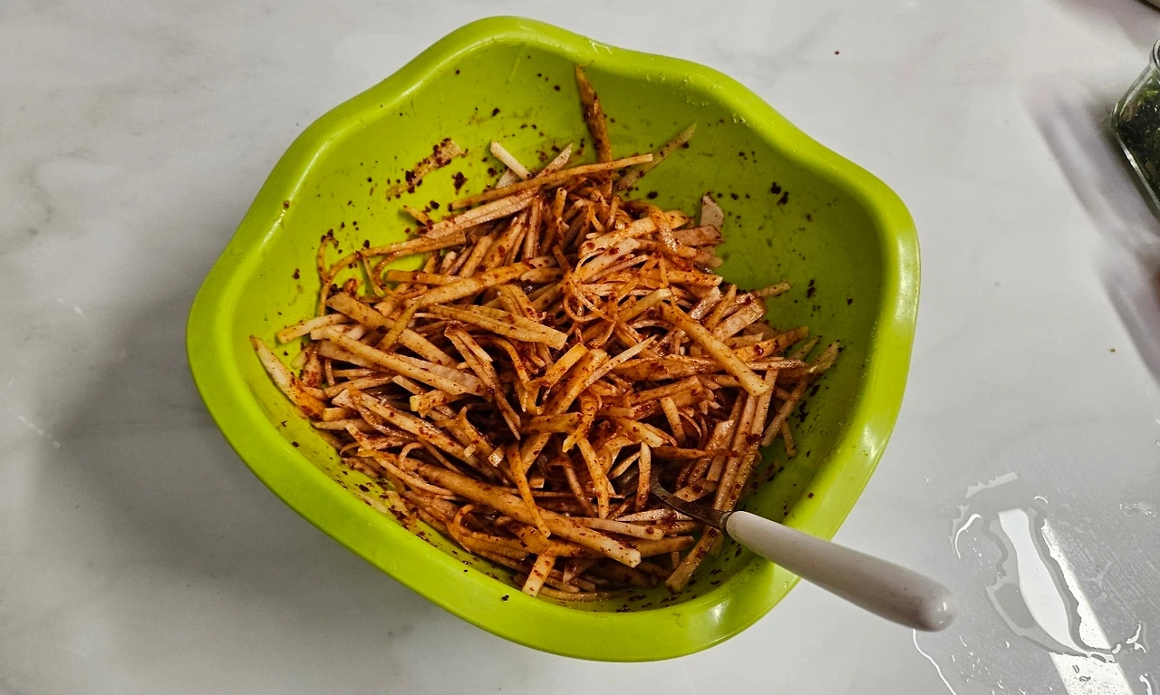 먹다 보니 첫 번째 무생채는 이틀 만에 다 먹어버리고 말았습니다. 말 그대로 순간삭제, 순삭입니다. 그리고 그 이후로 지금까지 보름 만에 총 네 개의 무로 네 번의 무생채를 만듭니다. 제가 이렇게까지 잘 먹었나 싶을 정도입니다. 어제가 바로 네 번째 제조였죠. 며칠 만에 무생채 장인이 되어가는 느낌이 듭니다.