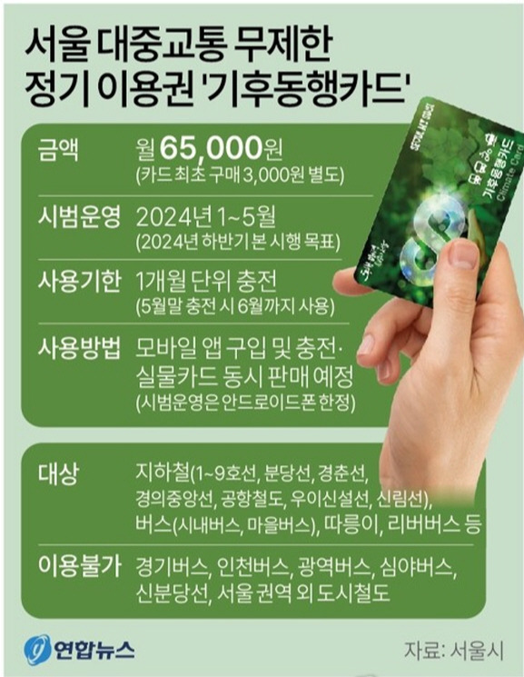 기후동행카드란 일정한 금액을 선납한 카드를 사용하면 서울 시내 대중교통을 무제한으로 이용할 수 있는 제도입니다.