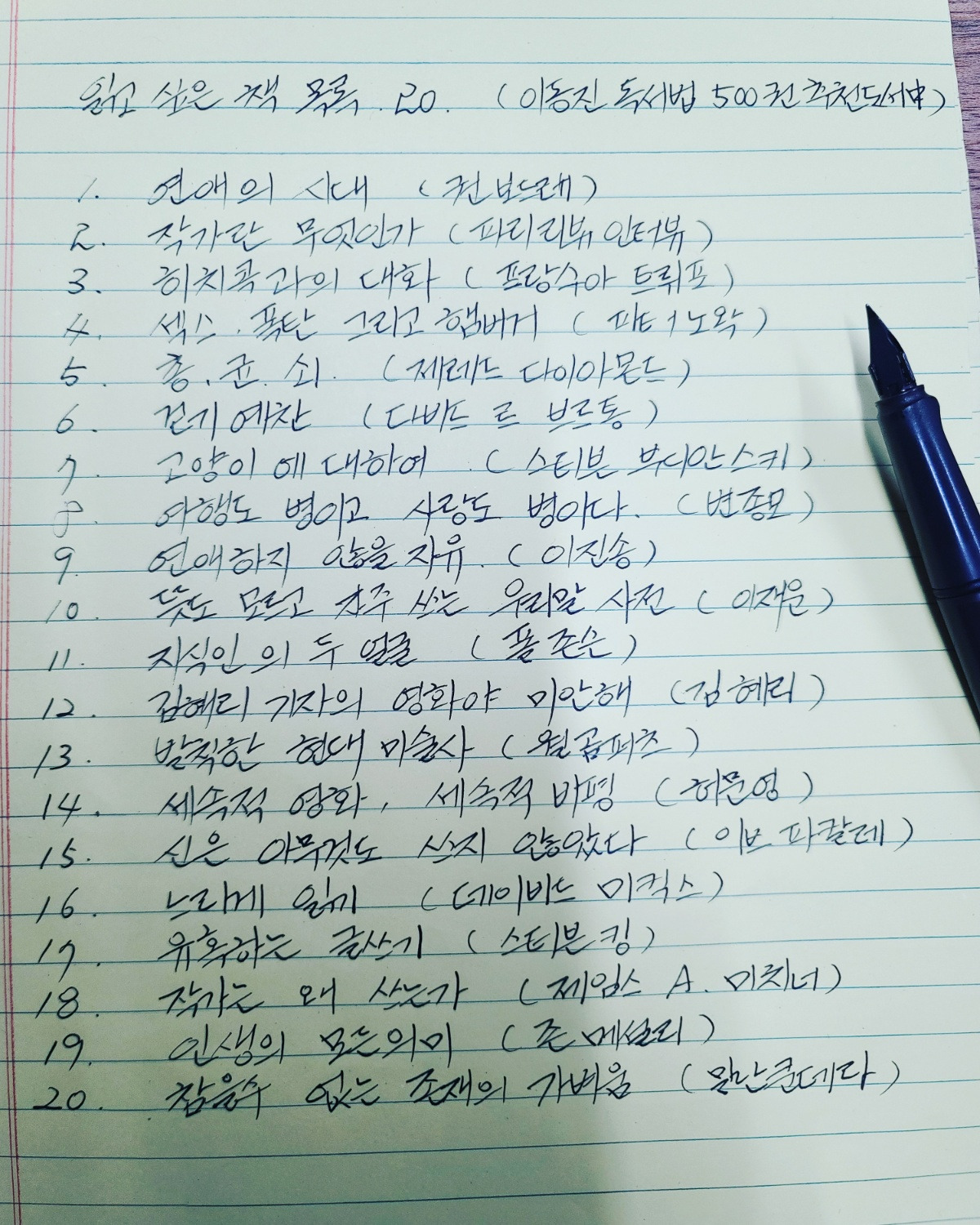 개정 증보판이 나오기 전에 읽었던 나는 500권의 추천도서 중 20권을 끌림이 있는 제목 순으로 20권을 나름 선별(개인적 취향) 해서 노트에 적어두고 죽기 전에는 꼭 읽어 보려고 마음먹은 적이 있다. 누군가는 이렇게 말할지도 모른다.