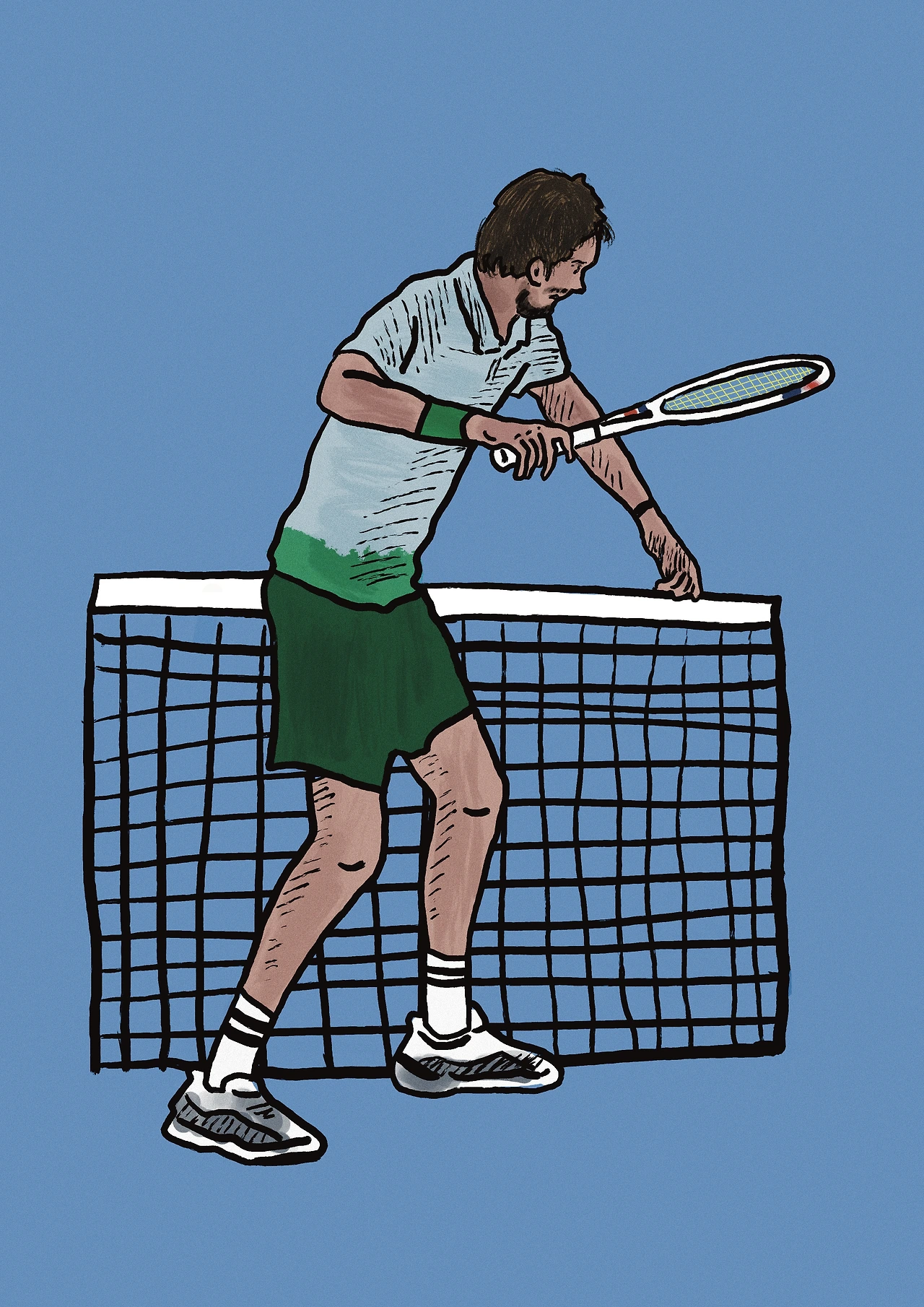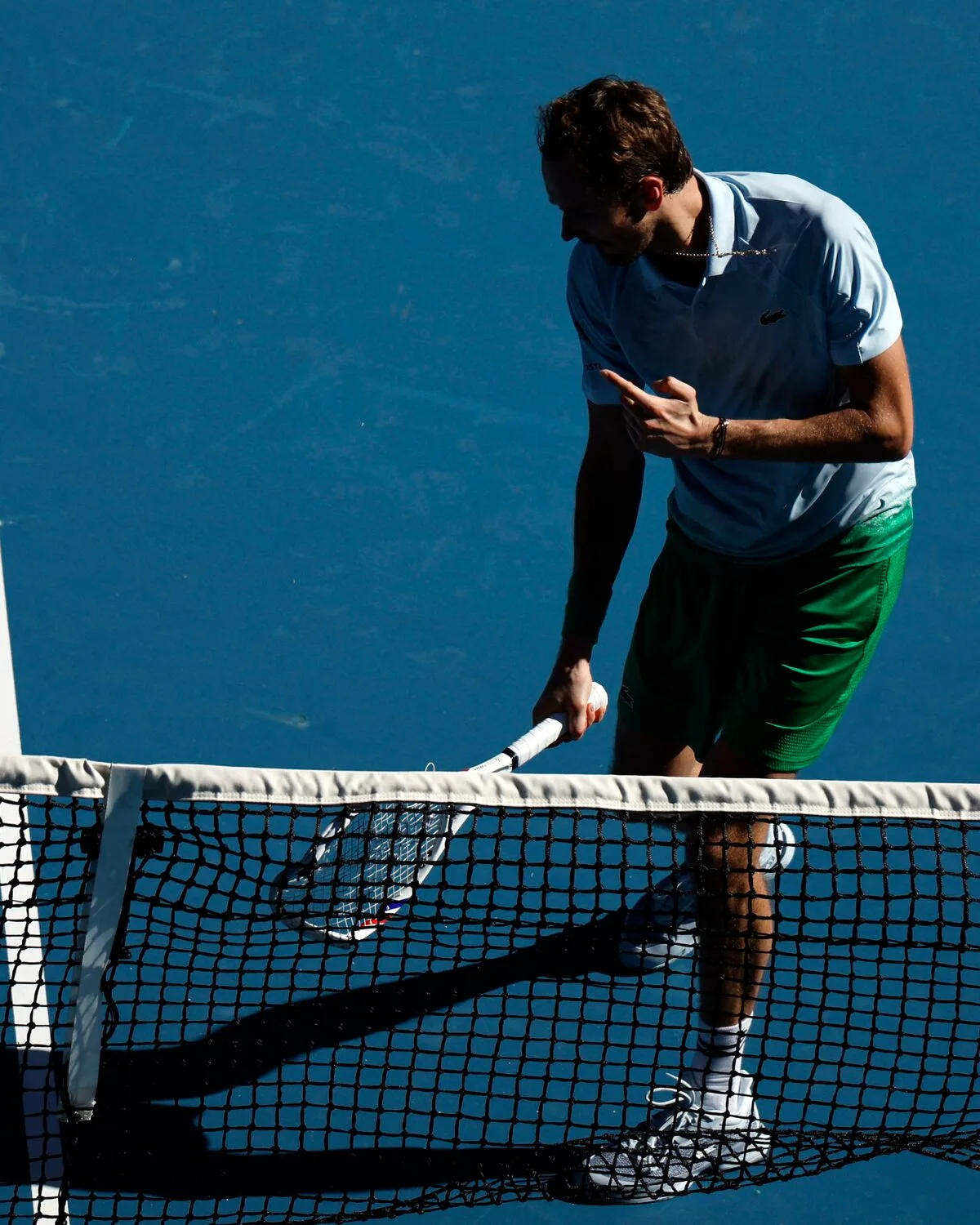 호주오픈 2025 1라운드에서 세계랭킹 418위인 태국의 카시딧 삼레즈를 상대로 풀세트 접전 끝에 힘겨운 승리를 거둔 메드베데프, 경기가 잘 풀리지 않자 흥분한 메드베데프는 네트 중앙에 있는 카메라를 향해 라켓을