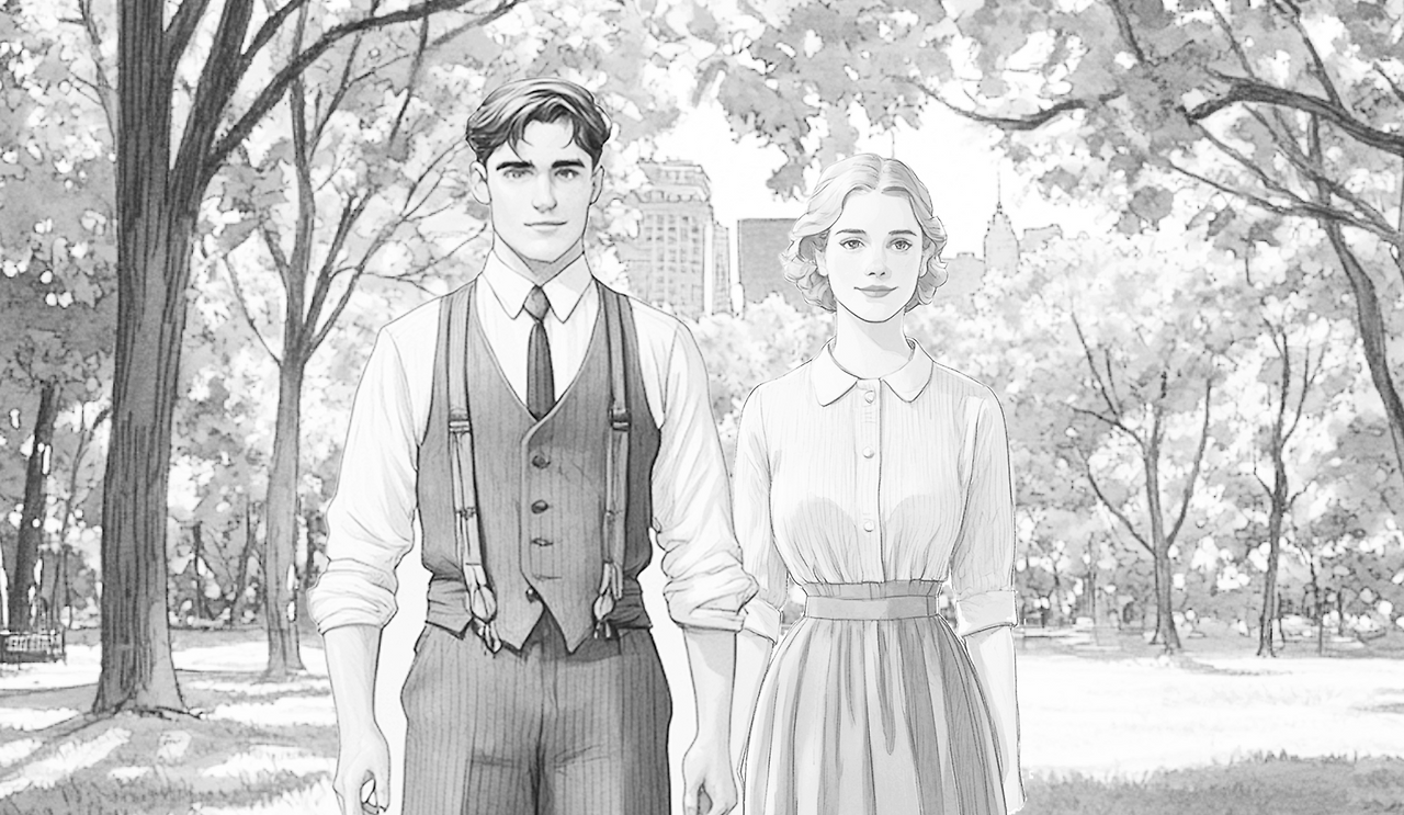 The 1940s. Central Park North, New York. A secluded spot, no people around.