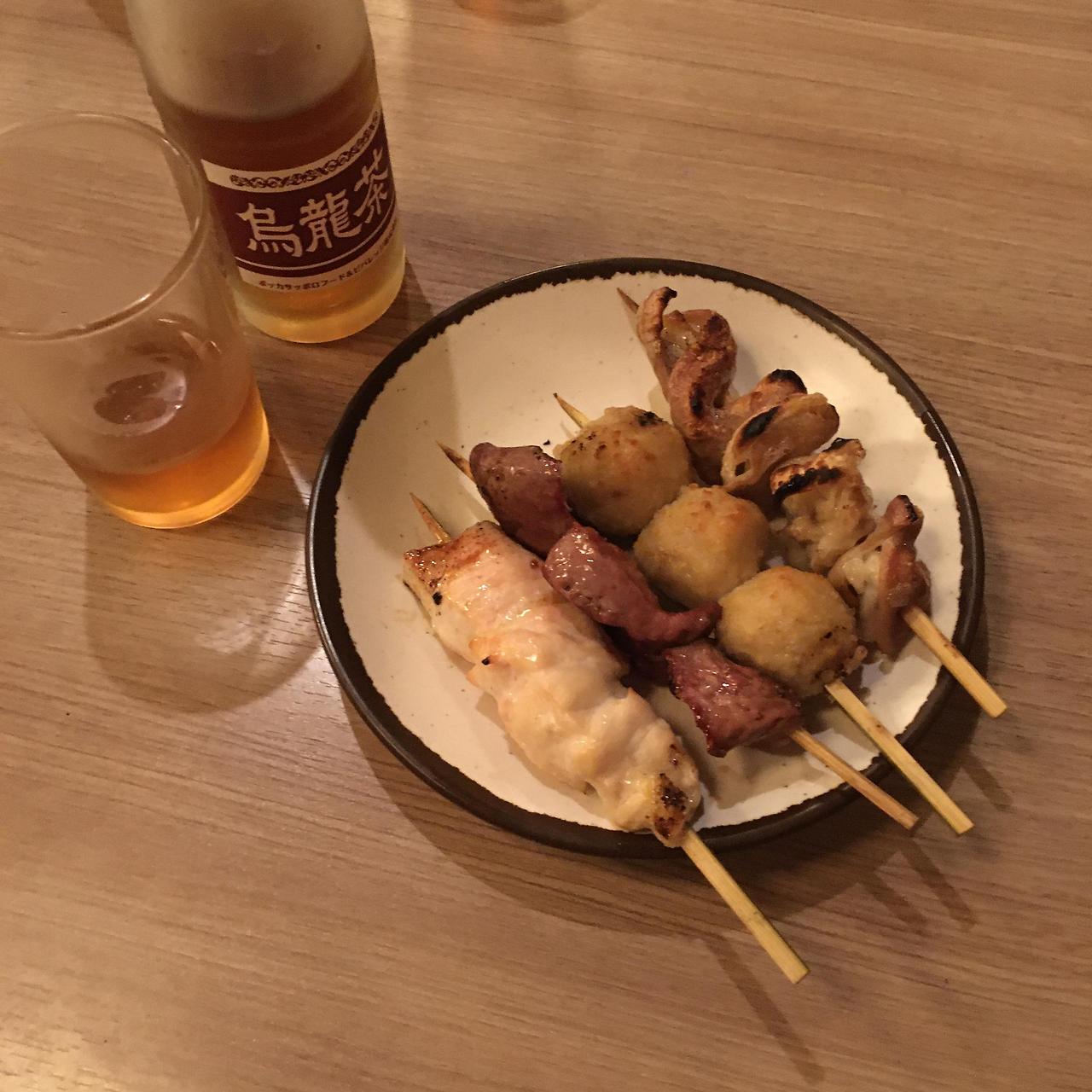 메뉴판을 보자 멘붕이 왔다. 전부 일본어. 하지만 당황하지 않고 파파고를 켜서 번역했다. 근데 번역을 해도 모르겠더라.. 직원분께 간단하게 추천을 받자 해서 추천받은 것이! 믹스 야키토리! 음료는 역시 일본 오면 꼭 먹고 싶었던 차가운 우롱차. 우린 이미 빙수를 하나 클리어해서 조금만 시키고 배고프면 더 시키자고 했다.
