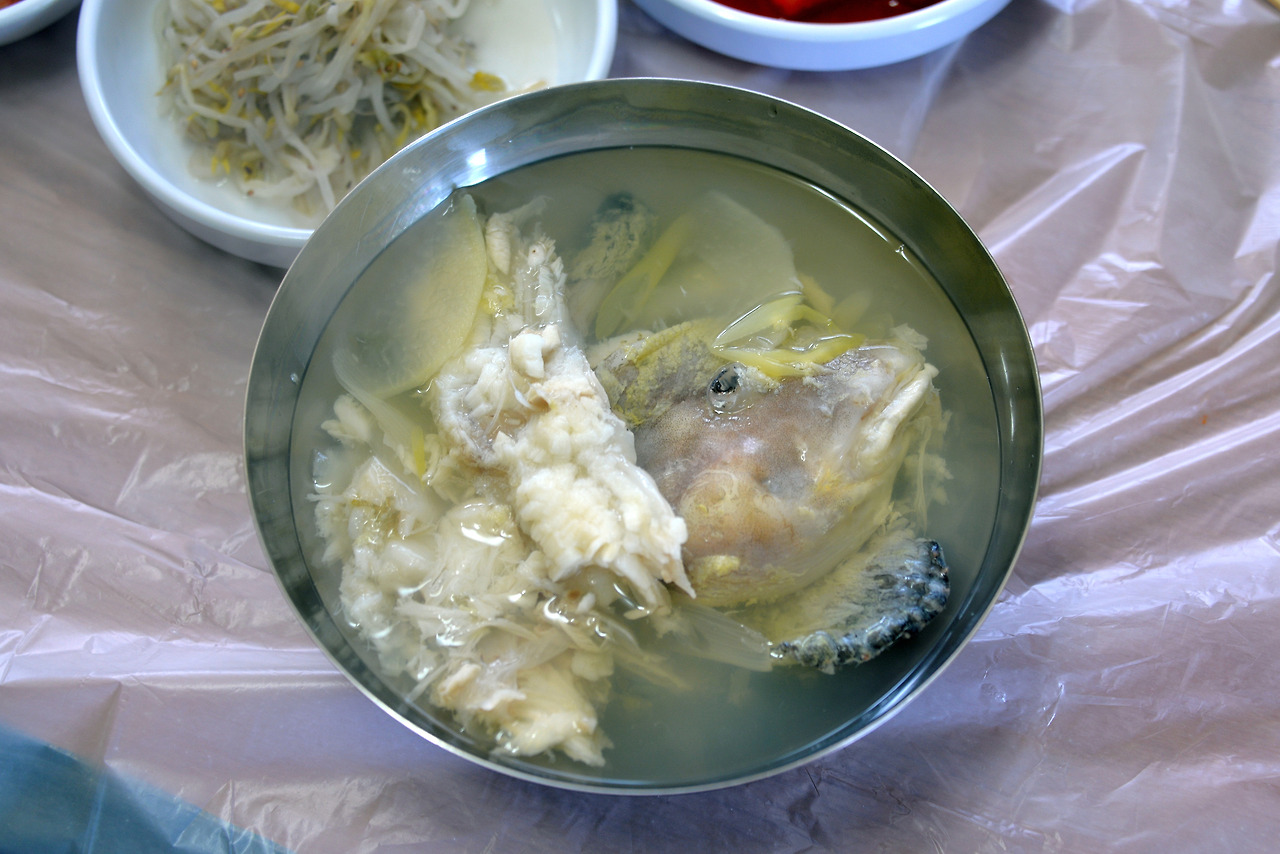 말린 물메기로 만드는 찜을 더 좋아하는 이들도 있지만 해장으로는 생물 물메기탕이다. 겨울이어야만 하는 까닭이다. 비린 맛이 없고 기름기도 없는 물메기를 통영에서는 끓는 물에 무와 물메기만 넣고 간을 해서 맑게 먹는다. 동해에서는 김치를 넣고 서해에서는 조금 얼큰하게 끓이기도 하지만, 통영 물메기탕은 맑게 마신다. 부드러운 물메기 살은 씹힐 것도 없이 스르르 위로 넘어가 술꾼들의 속을 풀어놓는다. 통영의 대부분의 식당에선 겨울 음식으로 물메기탕을 낸다. 대항마을 선착장의 이름 없는 슈퍼에서도 물메기탕을 맛볼 수 있다. 뽈락김치와 뽈락구이, 해풍으로 자란 나물들. 그리고 커다란 스테인리스 그릇에 무심히 담겨 나오는 뜨거운 '미기국'. 들판에 쑥이 나고 바람 사이에 살짝 온기가 스밀 때 즈음이면 식당들의 메뉴판의 '물메기탕'은 어느 사이엔가 '도다리 쑥국'으로 바뀐다. 그때가 통영의 봄이다. 그때까지는 통영은 물메기. 겨울인 게다.