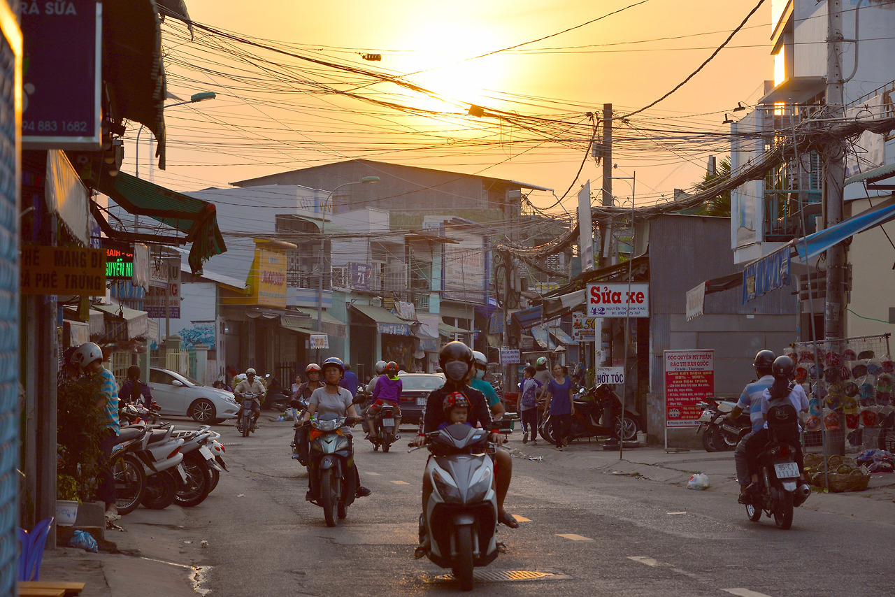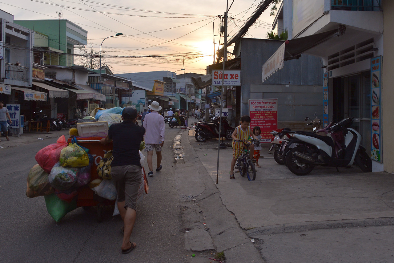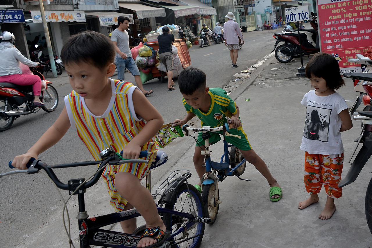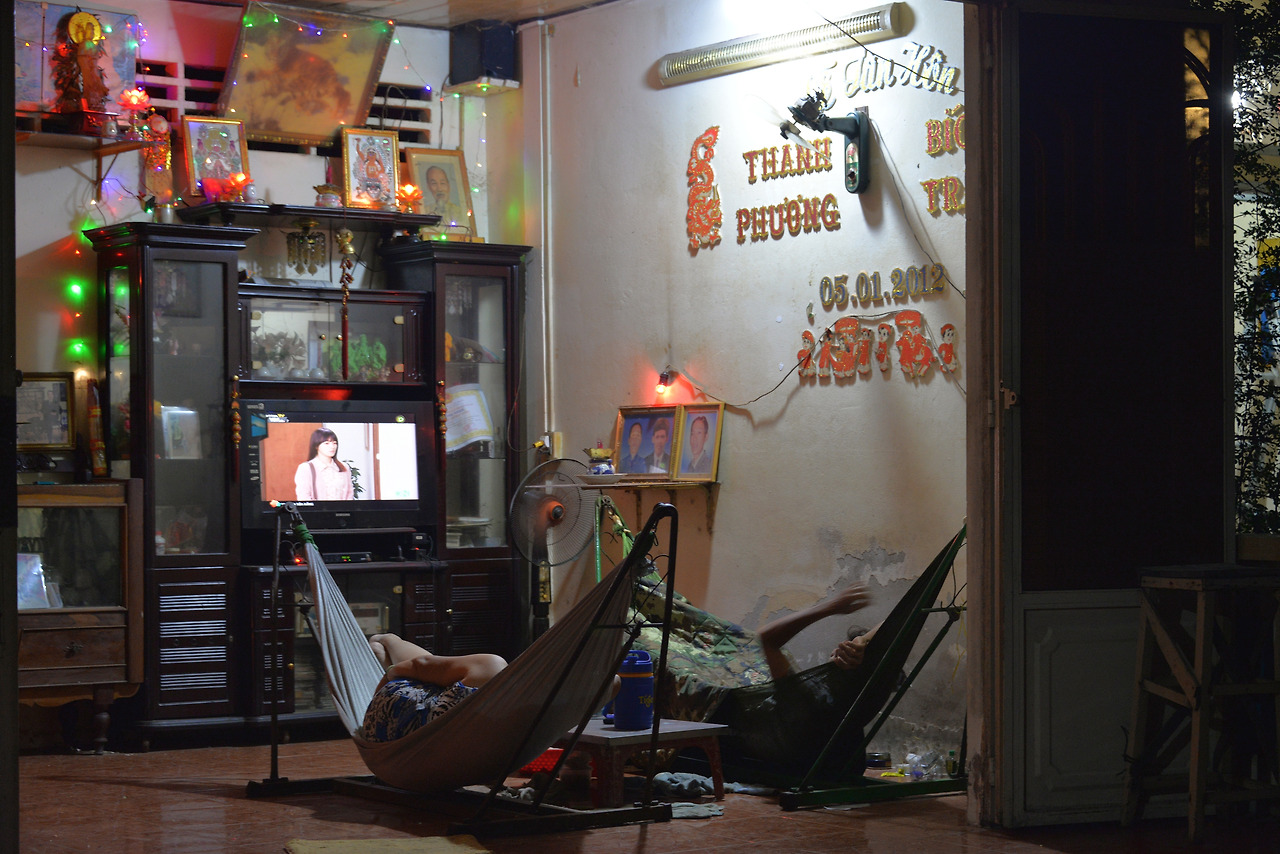 헴(hẻm)은 베트남에서 이런 골목을 부르는 단어입니다. 드엉(đường)이 '길'이라면 헴은 골목. 이 '헴'의 모습을 잘 볼 수 있는 곳이 껀떠에 있습니다. 강변 호치민 동상 옆의 선착장 벤파쏨차이(Bến phà Xóm Chài)에서 낡은 페리를 타고 강을 건너면 hẻm의 번호가 쓰인 작은 골목들의 입구들을 볼 수 있습니다. 자동차는 다닐 수 없고 오토바이나 자전거가 다닐 만한 폭의 골목을 사이에 두고 집들이 이어집니다. 작은 구멍가게들, 음식점도 가끔 보이지만 대부분 생활을 하는 집들이지요. 베트남은 더운 나라여서 그런 것도 있겠지만 많은 집들이 문을 닫지 않고 열어놓고 생활을 합니다. 밖에서 훤히 다 들여다 보이지요. 이웃들만이 아니라 저처럼 지나가는 행인에게도 밥을 먹고 누워 있고 TV를 보는 모습들이 다 노출됩니다. 늦은 밤이 되면 문을 닫기는 하는데 그 역시 완전히 가려지지는 않아서 잠을 자는 매트리스나 해먹이 밖에서도 보입니다. TV들이 대부분 대형인데 각 집에서 나오는 TV 소리들이 섞입니다. 가끔 노래방 소리와 대화하는 사람들, 술 마시는 사람들, 아이들이 웃는 소리까지 헴은 온통 사람 사는 소리들이 가득합니다. 해먹에 부부가 누워 드라마를 보고 그 옆에서 아이들이 장난감을 가지고 놀고 있는 집들 사이를 걷고 있자면.. 저 골목 끝에는 저를 기다리는 집 하나 정도는 있지 않을까 하는 기분도 듭니다. 기왕이면 해가 질 시간 정도에 가면 더 좋을 겁니다. 집으로 돌아오는 사람들, 구멍가게에서 만나 얘기하는 할머니들, 저녁 준비하는 사람들, 저녁을 함께 먹는 가족들을 볼 수 있거든요.