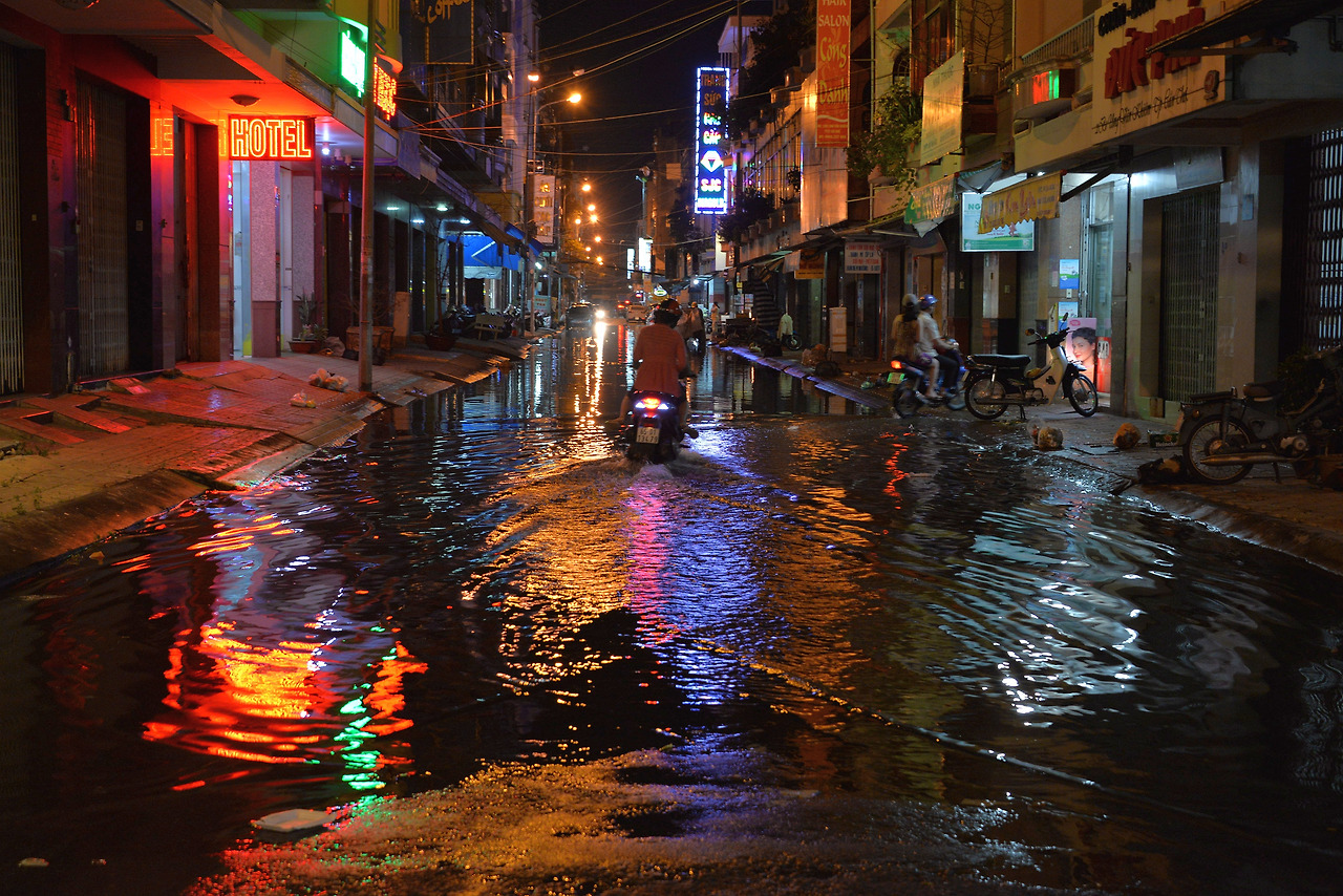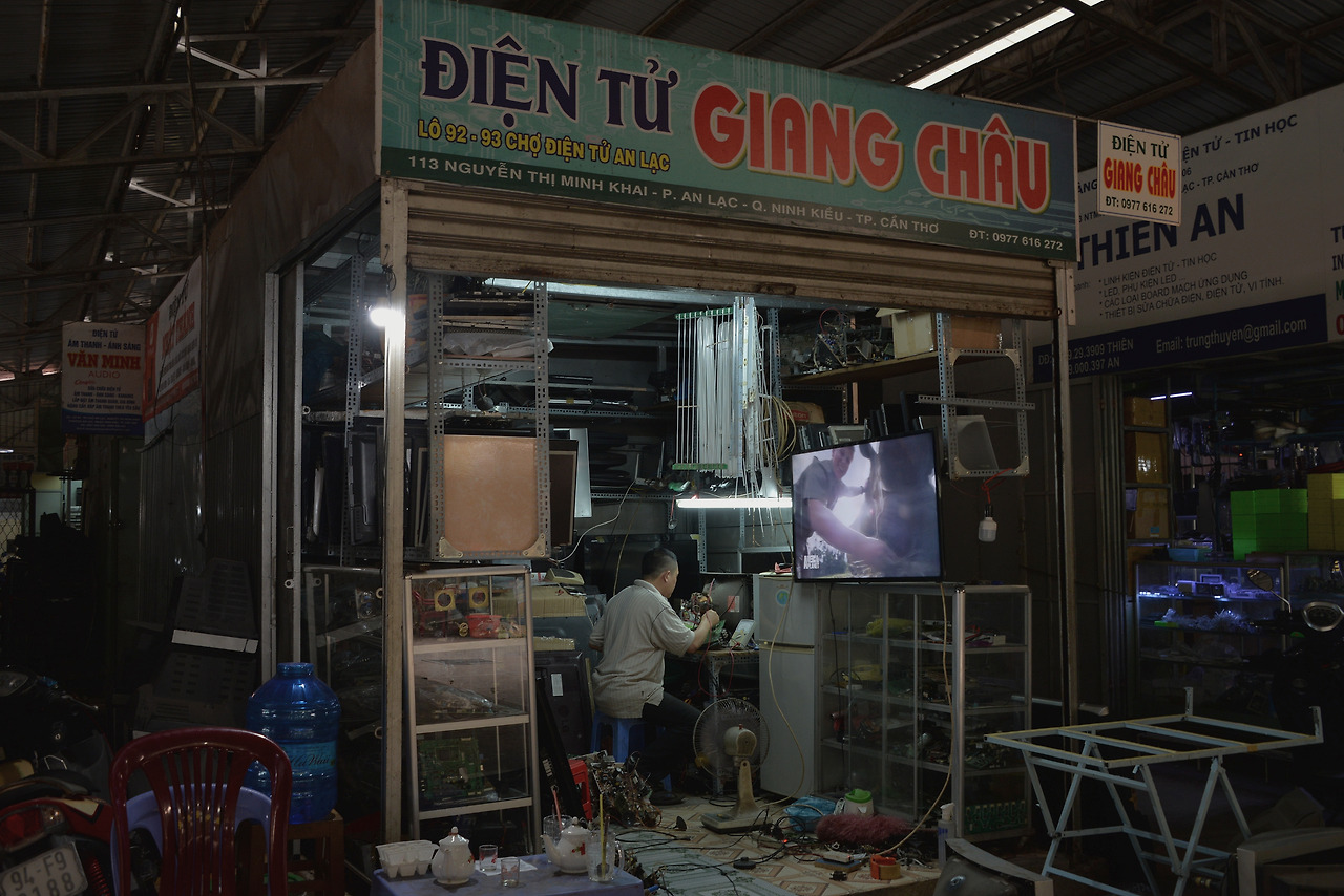 껀떠대학교에서 강으로 이어진 대학가에서 강변을 따라 닌끼어우 선착장까지 이어지는 길은 오래된 시장들이 연달아 있습니다. 안락 시장(Chợ An Lạc)은 크진 않지만 전자제품류나 의류, 신발류 같은 전문상점들과 음식점들이 모여 있습니다. 껀떠 성당도 이 길에 있지요. 조금 더 올라가면 길이 갈라지면서 과일, 농산물, 수산물들을 파는 노점들이 가득한 큰 시장 탄안 시장(Chợ Tân An)이 나옵니다. 오래된 식당들, 오토바이를 타고 저녁 장을 보러 온 껀떠 시민들. 시장 카페, 철물 시장, 그 사이사이로 역시 좁은 골목들이 복잡하게 이어지고 언제나 그 자리에 있었던 것 같은 표정의 노인들 사이로 공을 차는 남자아이들과 그 뒤를 쫓아다니는 어린 여자아이들이 뛰어다닙니다. 교복을 입은 소년들이 오토바이를 타고 골목 안으로 사라지면 건너편 성당 안에서 소녀들의 웃음소리가 새어 나오지요. 껀떠 강 다리 너머로 해가 지기 시작하면 이 오래된 시장길은 서서히 하루를 닫기 시작할 겁니다. 헴. 작은 골목들을 끼고 마주 보는 껀떠 사람들의 집들은 다시 모여든 가족들이 서로의 얼굴을 보고 함께 밥을 먹는 시간들로 채워집니다. 물끄러미, 그 주변을 서성이는 여행자는.. 밤이 깊어 새벽을 생각할 시간이 될 때까지 골목을 나와 길과 길을 배회합니다. 껀떠에선 보름달이 되면 강물이 중력에 끌려 올라와 길 위로 올라온다고 하더군요. 붉은색 호텔 네온이 보름달에 끌려 올라온 강물에 비치네요. 집에서 멀리 와 있었나 봅니다.