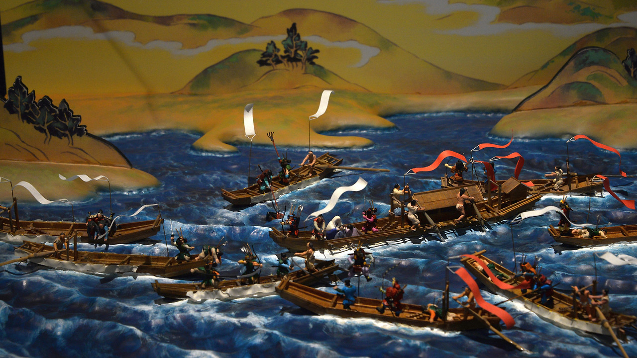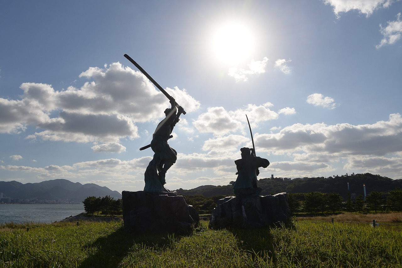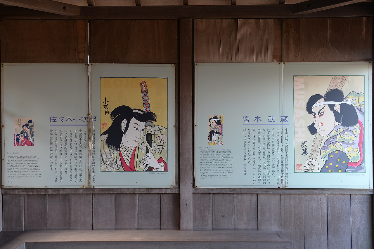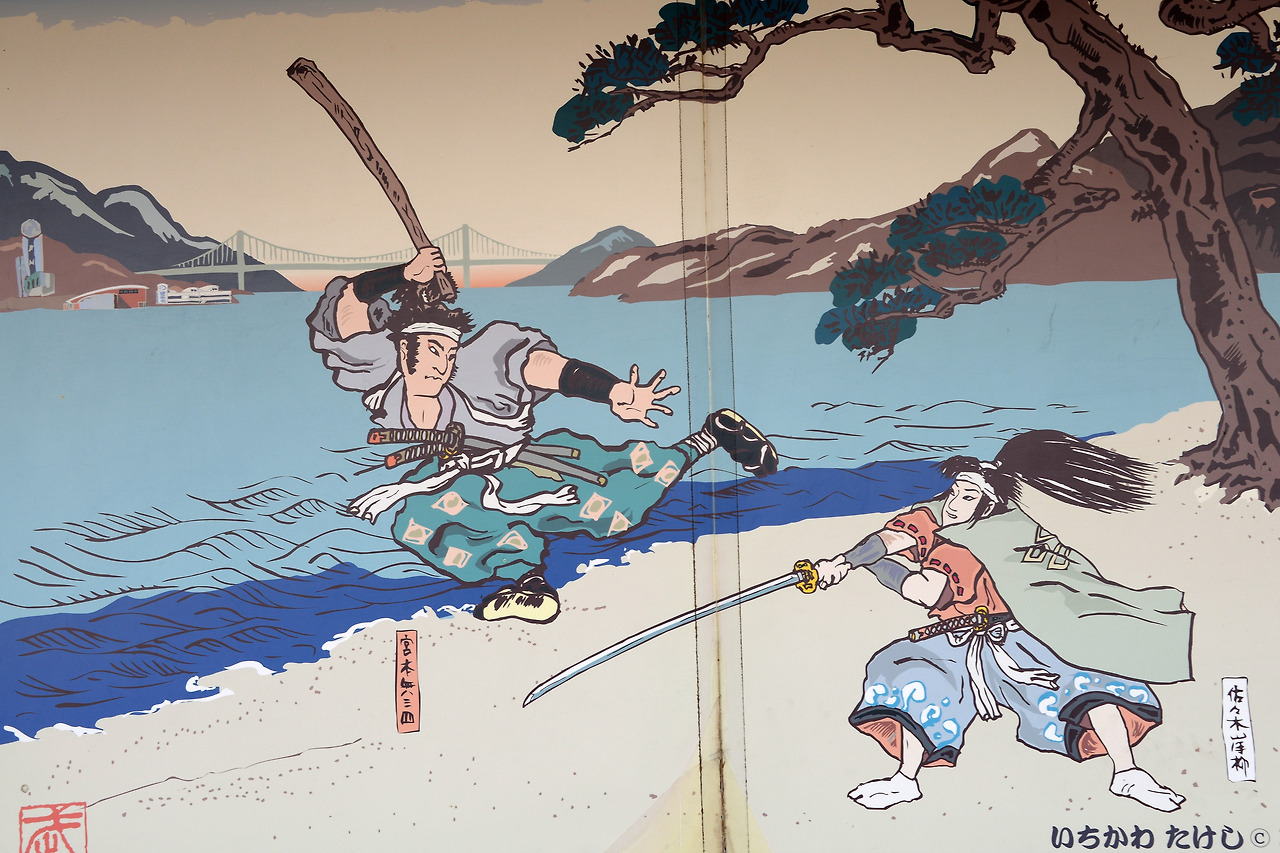 시모노세키 항구와 맞은편 모지 항구 중간 정도에 작은 섬 간류지마(巌流島)가 있습니다. 이노우에 다케히코의 만화 ‘배가본드’를 보신 분은 기억하실 이름입니다. 주인공 미야모토 무사시(宮本武蔵)가 사사키 고지로(佐々木小次郎)와 결투를 한 장소지요. 시모노세키와 모지 양쪽에서 배가 다닙니다. 작은 무인도일 뿐인데 ‘결투의 성지’로 워낙 유명해져서 두 사무라이가 칼을 들고 마주하고 있는 동상과 여기서 죽은 사사키 고지로를 기리는 작은 사당이 있고 그걸 보러 꽤 많은 사람이 이 곳에 옵니다. 저도 마찬가지였지요. 미야모토 무사시는 오다 노부나가가 죽고 도요토미 히데요시가 권력을 잡을 즈음에 태어나서 전국시대 말기를 살았던, 어쩌면 제일 ‘유명한’ 검객이지요. 19세에 앞에서 언급한 세키가하라 전투에도 참전했다는데(누구의 휘하였는지는..) 이후로 60여 차례 결투에서 한 번도 패하지 않다가 이 ‘간류지마 결투’에서 사사키 고지로를 이긴 후에는 근처 구마모토 번에 들어가서 중급 사무라이 검술 사범으로 살았다고 하더군요. 실제로 대단한 검객이었겠지만 떠돌이 낭인이어서 이름이 더 났을 뿐, 다이묘나 가신 사무라이들과는 다른 식으로 전국시대를 살아낸 사람입니다. 번사(번에 소속된 사무라이)였다면 어쩌면 못난 주군을 따라 할복하거나 높은 자리를 얻으려는 정쟁에 휩쓸려 검술을 연마할 생각을 못했겠지요.
