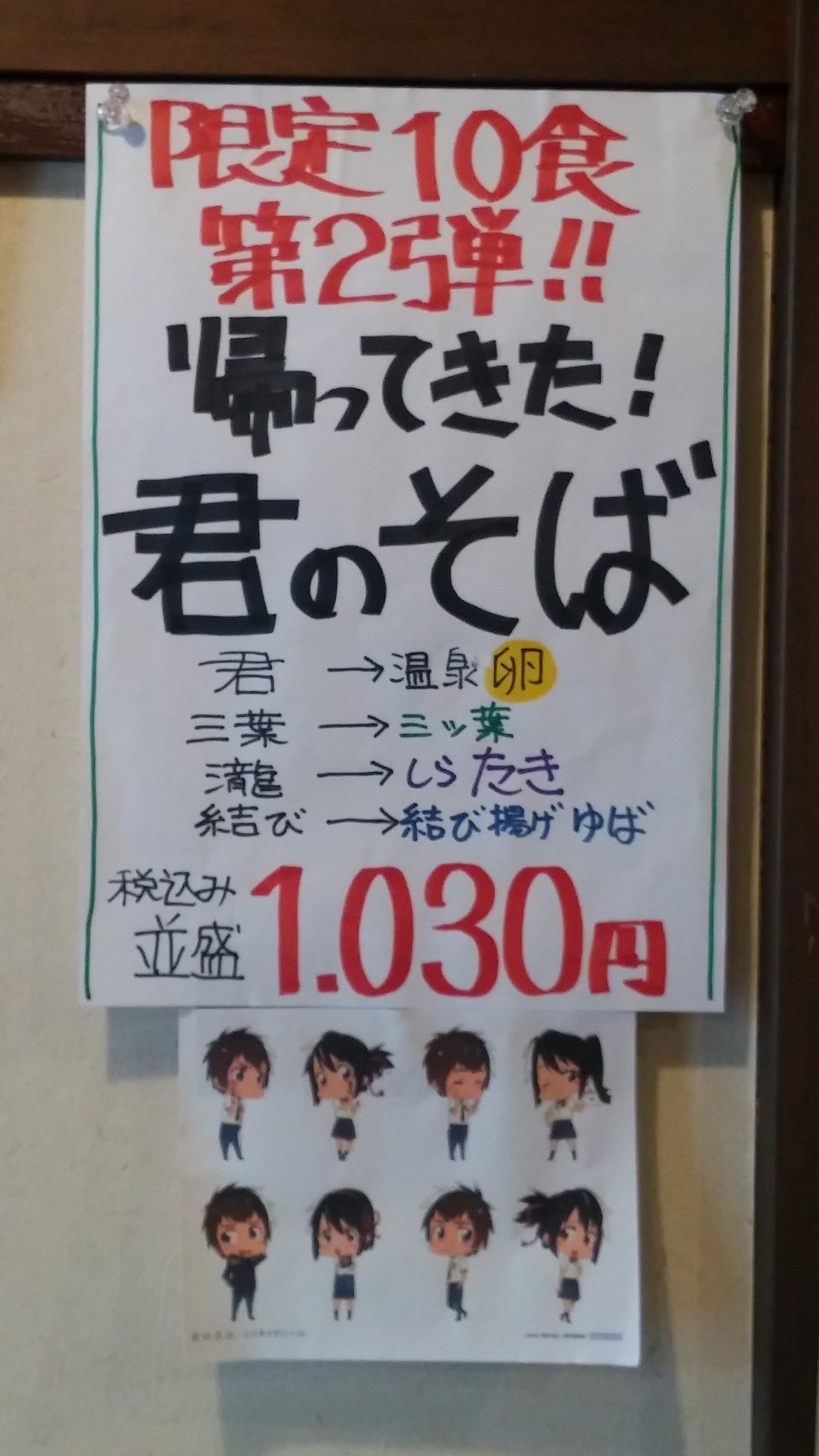 기후 현 북쪽, 산으로 둘러싸인 작은 도시 히다후루카와(飛驒古川)는 몇 년째 유명세를 타고 있다. 2016년 일본 영화 흥행 기록을 새로 쓴 신카이 마코토의 애니메이션 ‘너의 이름은(君の名は)’의 무대가 바로 이 곳이다. 영화의 흔적을 찾아오는 사람들이 늘면서 마을은 온통 너의 이름은 상품으로 가득하다. 몇 년이 지났는데도 영화 속 장소들을 순례하듯 찾아다니는 사람들을 쉽게 만나게 된다. 그렇게 마을을 다니다 눈에 들어온 마을 한쪽의 소바집에서는 영화 제목을 붙인 한정판 소바를 팔고 있었다. 여주인공 미츠하(三葉)의 이름에서 미츠바(일본 파슬리) 잎 세 장을, 주인공들의 연결된 인연을 뜻하는 실곤약을 묶어 고명으로 얹는 식으로 영화의 내용을 소바에 구현했다. 하루에 단 열 그릇. 한정판 마케팅에 능한 일본답다. 영화 순례를 온 팬들로서는 놓치기 힘든 유혹이다. 영화 마케팅이 아니었어도 인기 있는 소바집인 걸 양복을 입고 묵묵히 소바 접시를 들고 있는 중년 남자들을 보니 알 것 같다.
