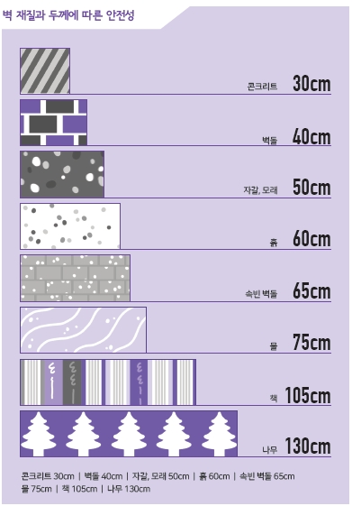 그렇다면 만약, 핵공격이 일어난다면 어떨까? 그야말로 최악의 상황이지만 어느 정도 희망이 있다. 단, 폭심지 주변은 어떠한 희망도 없으므로 예외로 두자. 그 외의 폭풍, 열, 초기 방사선을 피할 수 있다면 생존 가능성은 있다. 국민재난 안전포털은 핵 및 방사능 관련 대피공간의 재질로 다음과 같은 대안을 제시하고 있다.