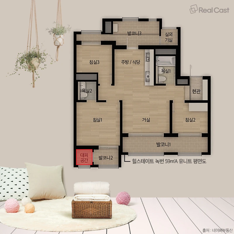 고층아파트 발코니 옆에는 의문의 공간이 존재한다. 이 공간은 실내임에도 단단한 방화문으로 격리되어 있다. 바닥이 그냥 타일로 마감되어 있다면 그곳은 단순한 대피공간이다. 그 대신 무언가 경고표지가 붙은 금속제 문이 바닥에 붙어있다면 그곳은 하향식 피난구실이다. 화재가 발행하면 자동으로 전 층의 피난구가 개방되어야 하므로 평소에도 물건을 쌓아둬서는 안 된다. 나를 포함해 모든 윗집 사람들의 생명을 위협하는 민폐다.